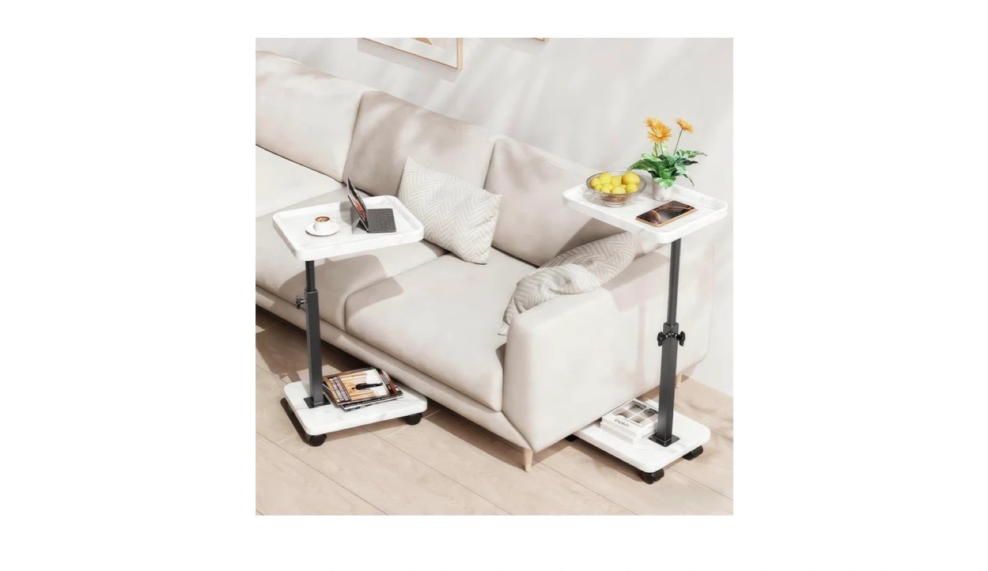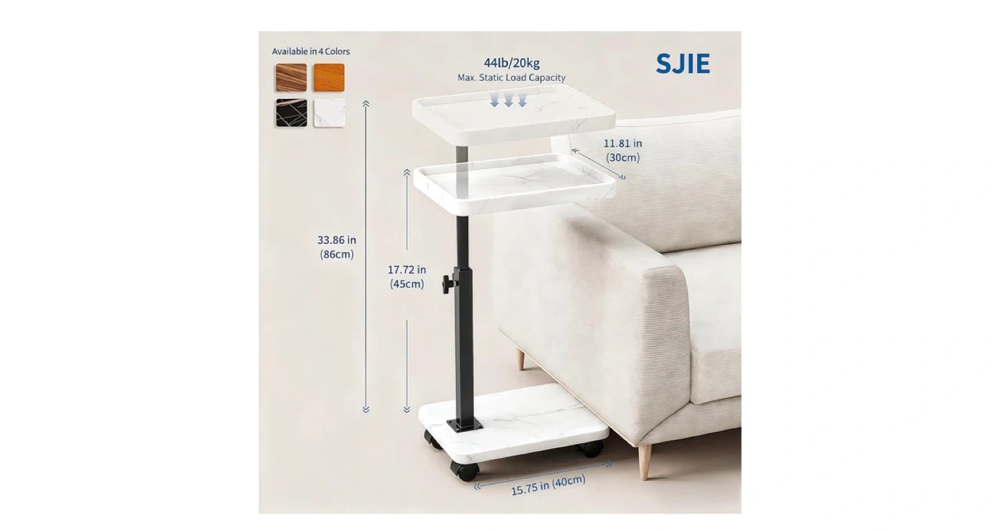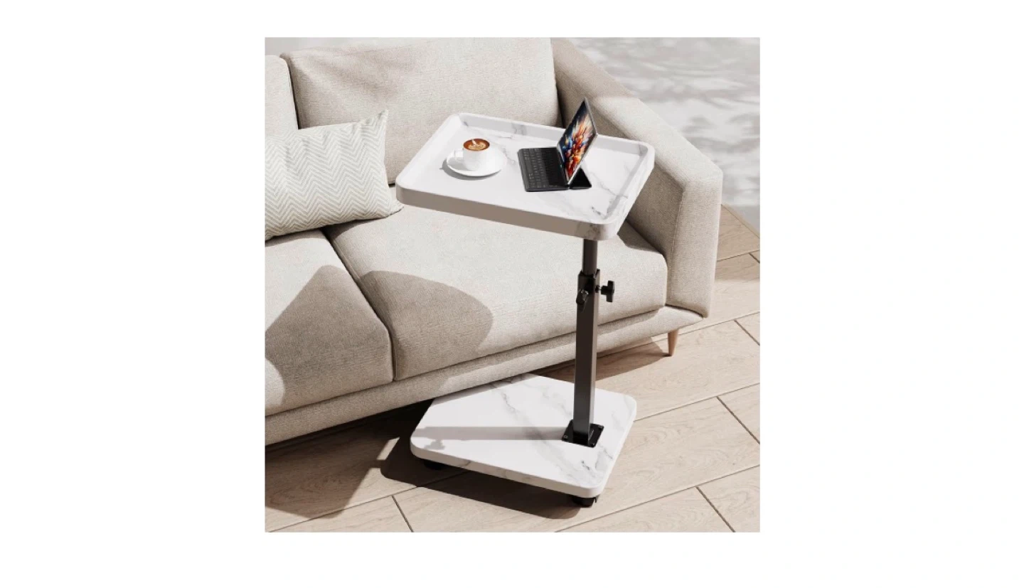 This SJIE rolling side table is adjustable in height. It has a white marble finish and a 4-tier structure with waterproof and easy-to-wipe surfaces. The base includes wheels for mobility.