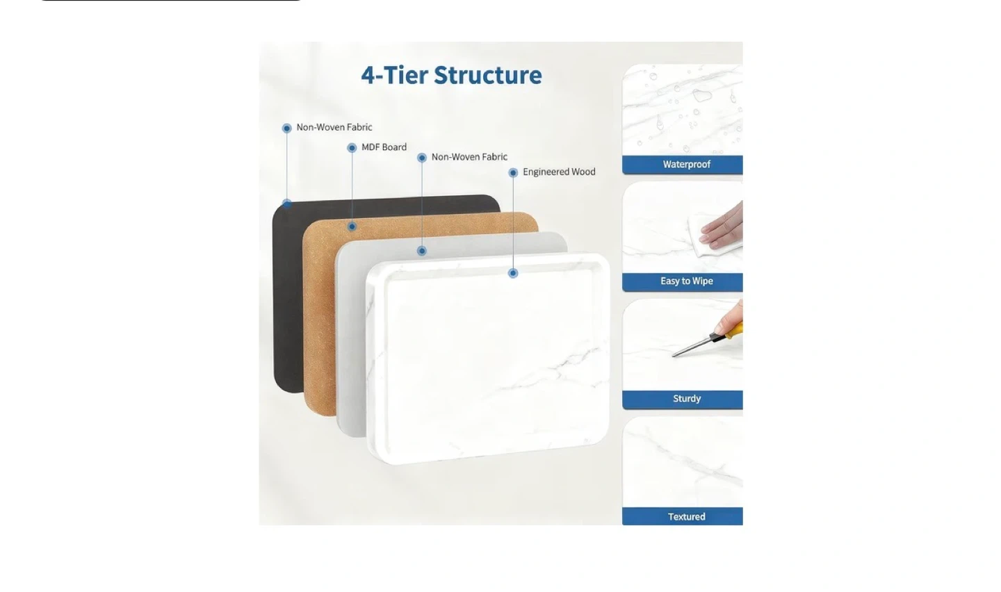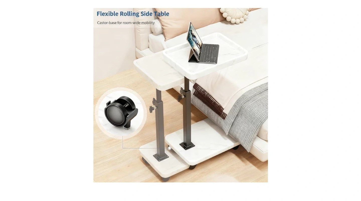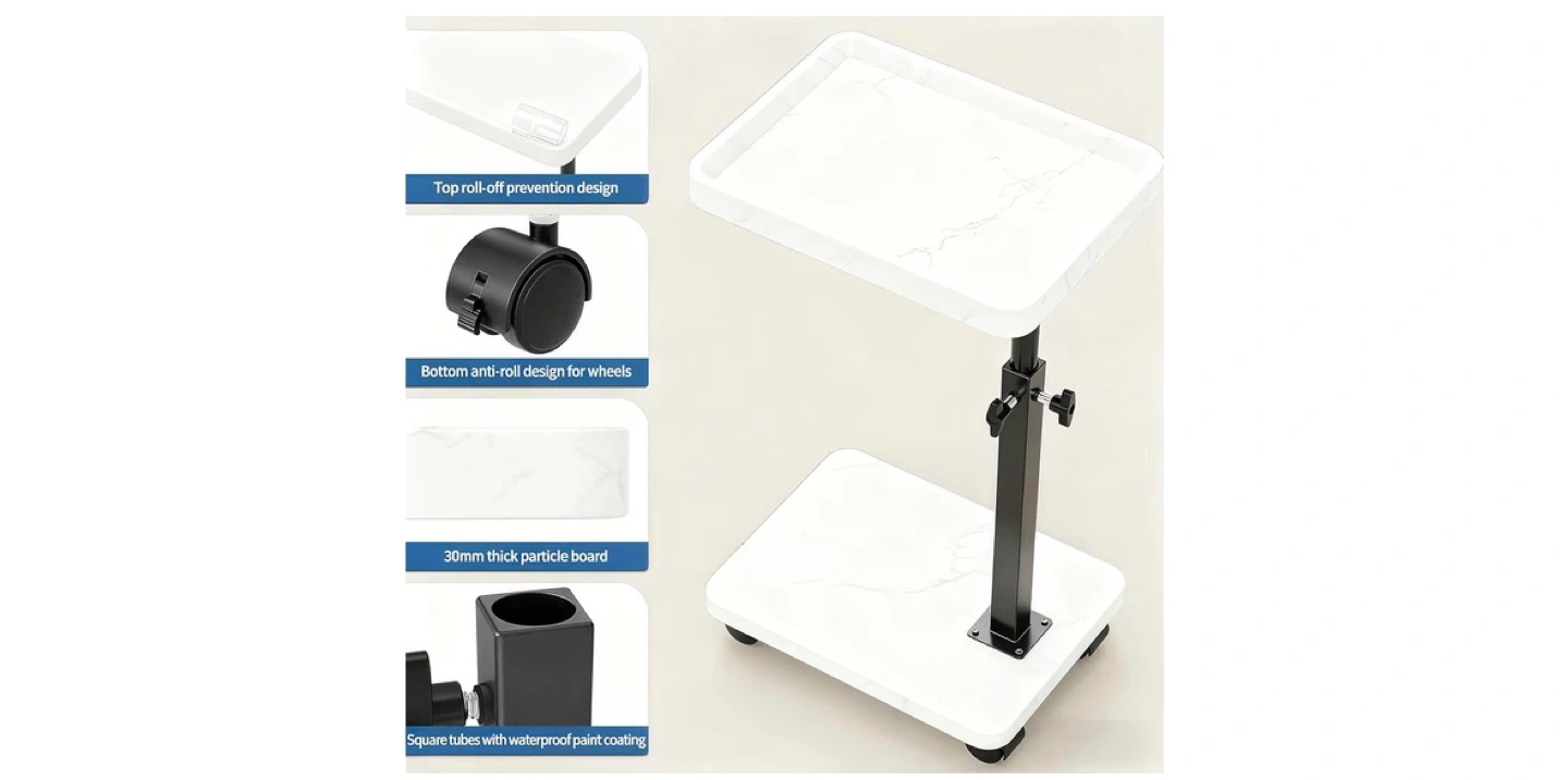 This SJIE rolling side table is adjustable in height. It has a white marble finish and a 4-tier structure with waterproof and easy-to-wipe surfaces. The base includes wheels for mobility.