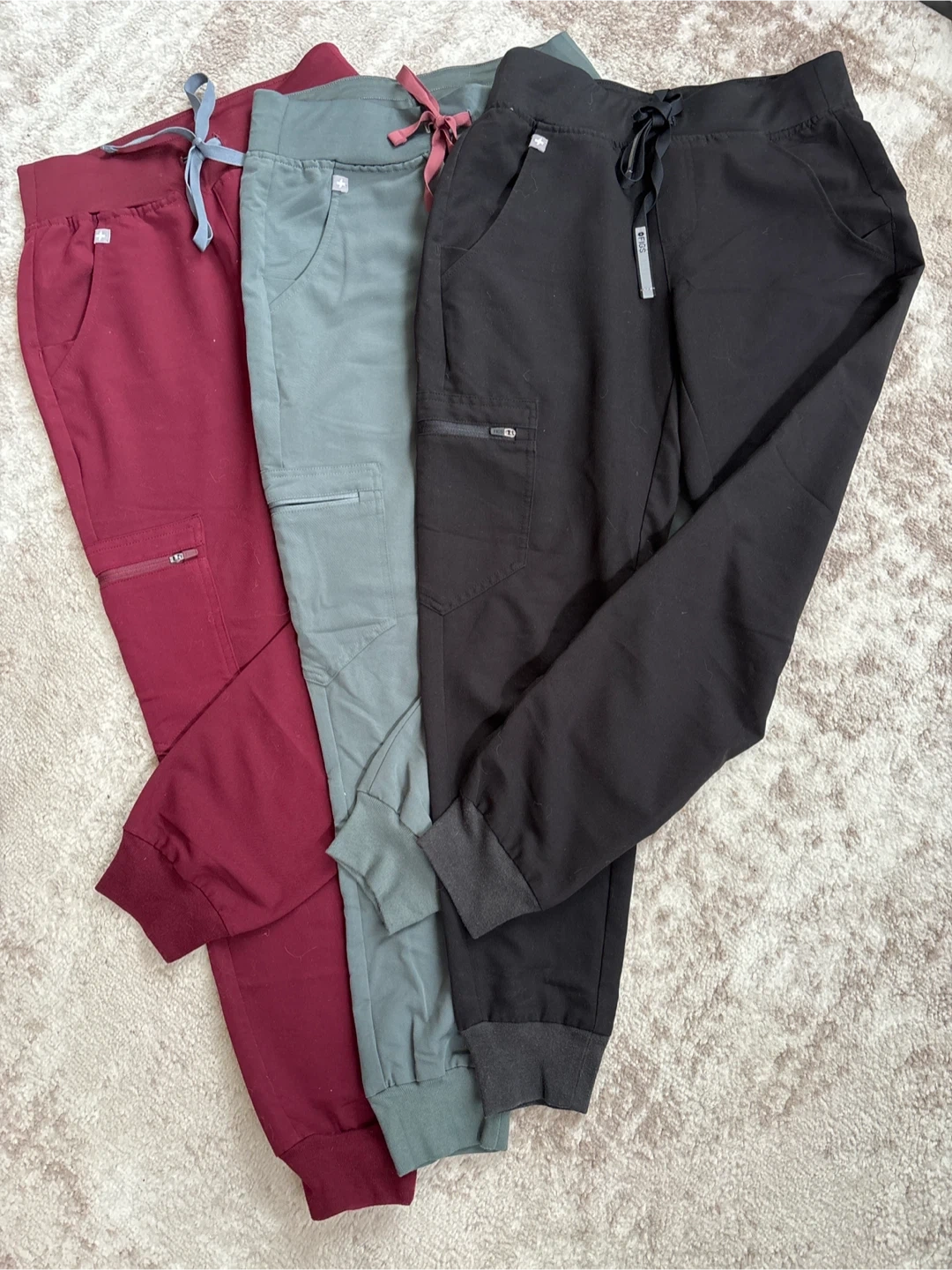 Three pairs of FIGS scrub pants in black, burgundy, and seafoam green. These jogger-style scrub pants feature a drawstring waist and multiple zippered pockets. Material is a comfortable polyester blend. SIZE XS. Price is Per Item. Make an offer for all 3!