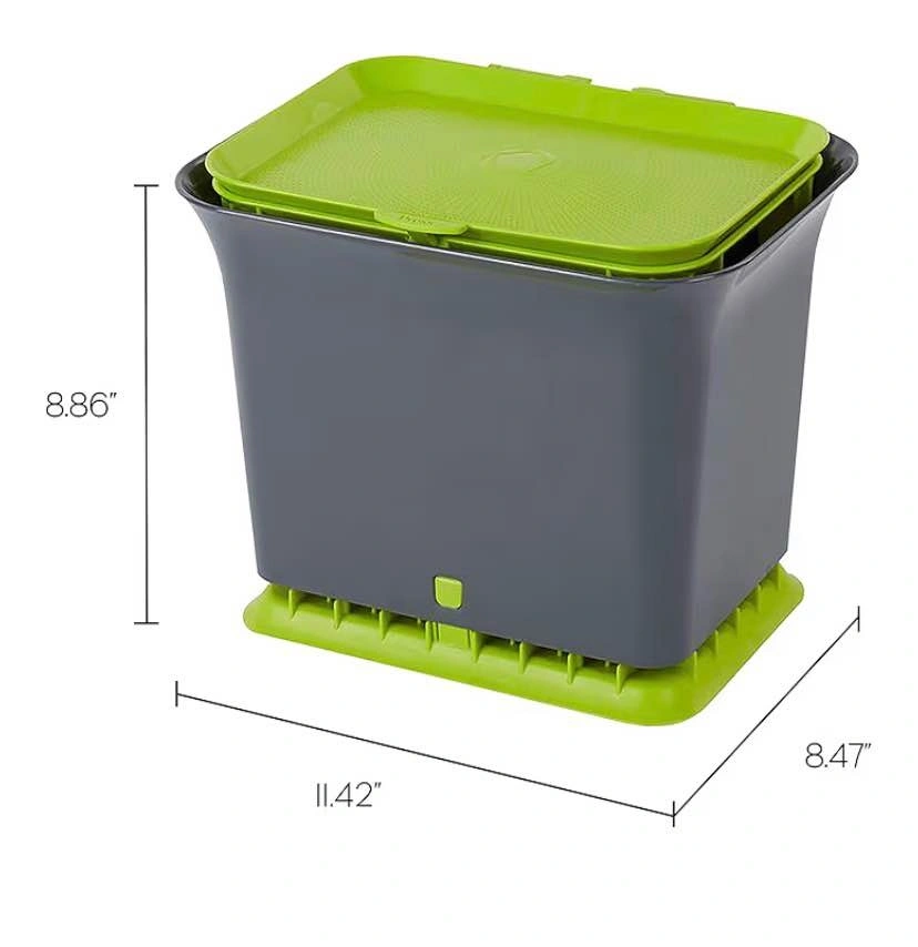 This compost collector features a charcoal filter to help control odors. It's designed for easy use and cleaning. The green slate color adds a nice touch to your kitchen counter. Feel free to message if you have any questions!