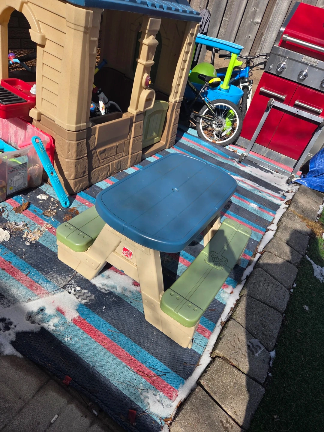 A durable Step2 picnic table with two attached benches. Beige and tan base with a blue tabletop and green benches. Easy to clean plastic material.