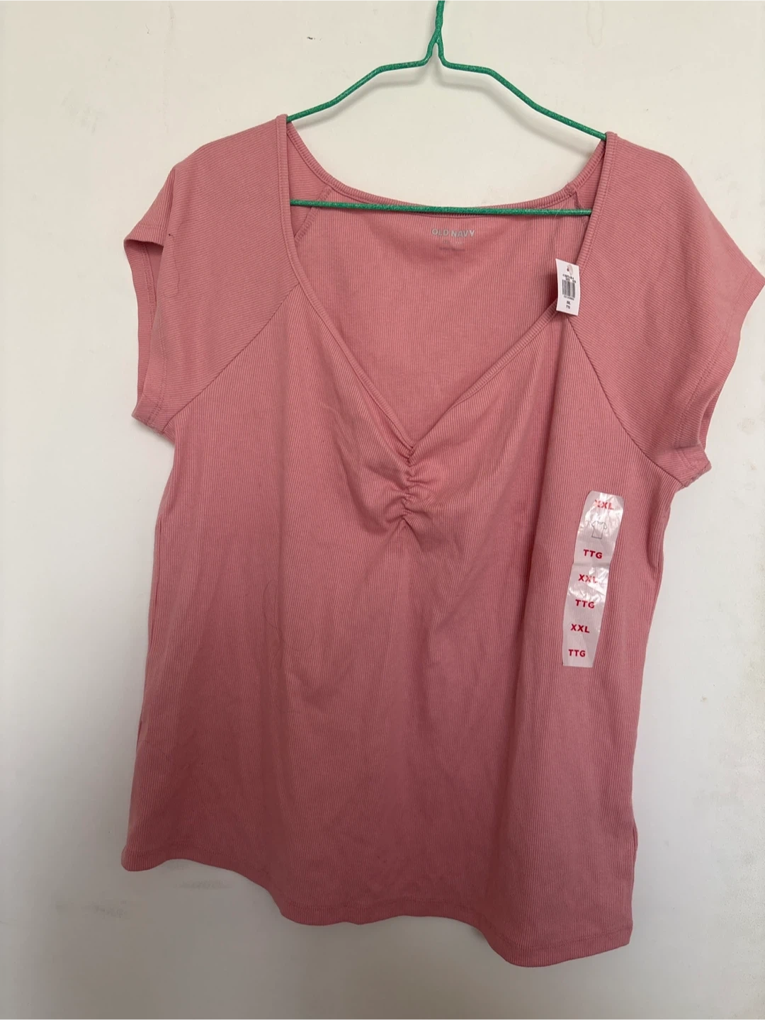 This Old Navy top is a lovely dusty rose colour and features a ribbed texture. It has a V-neck with a ruched detail at the bust and short sleeves. Size is XXL.