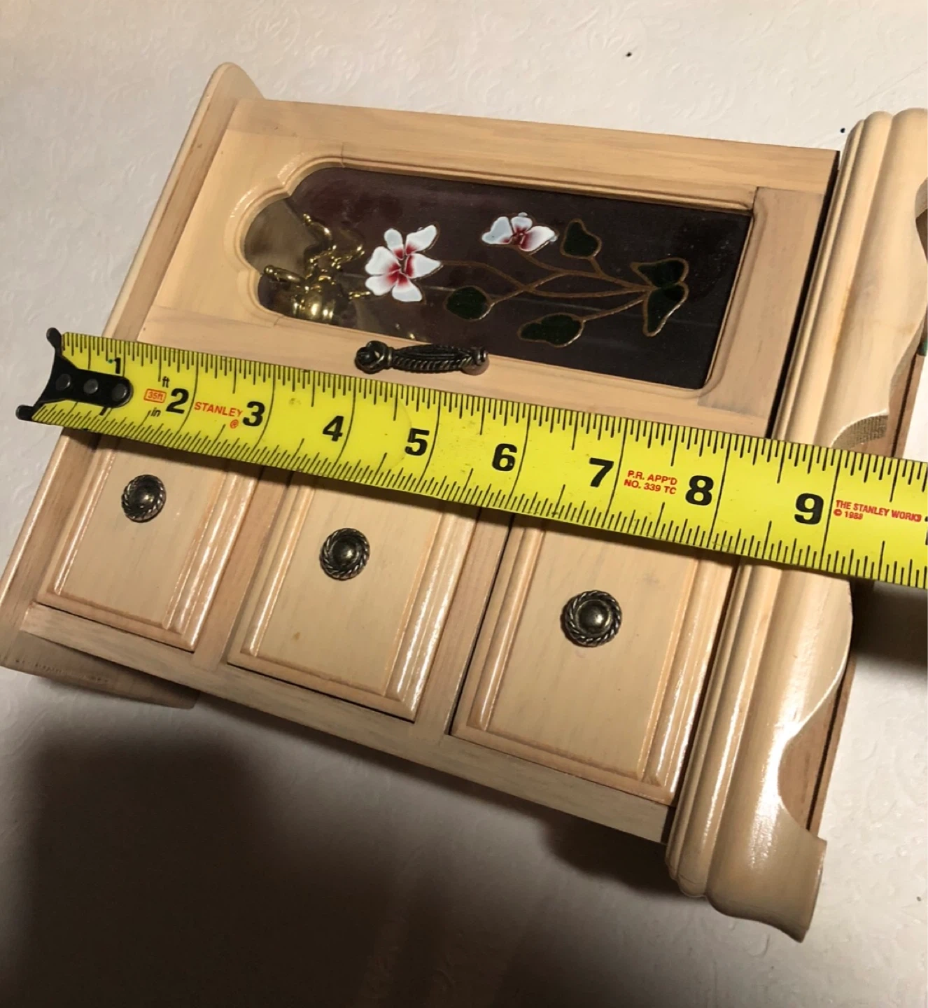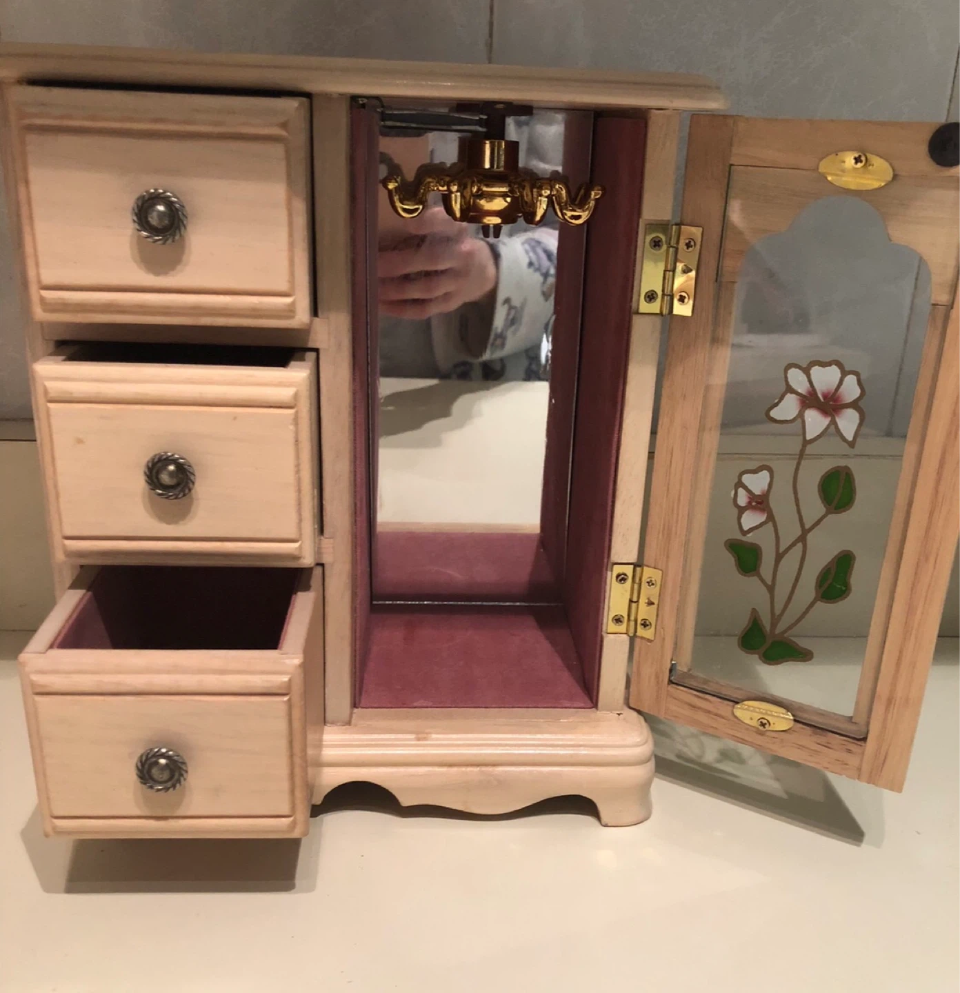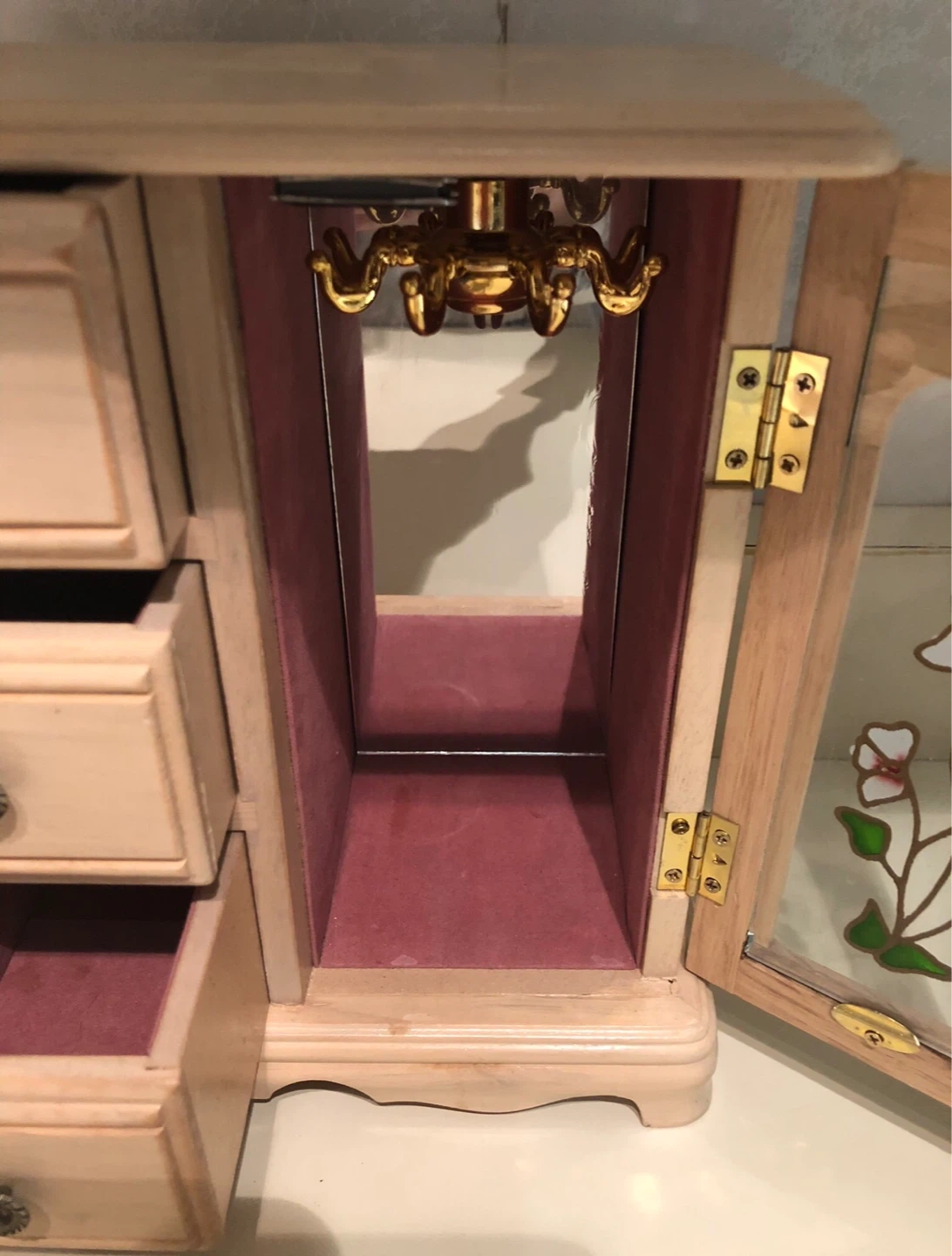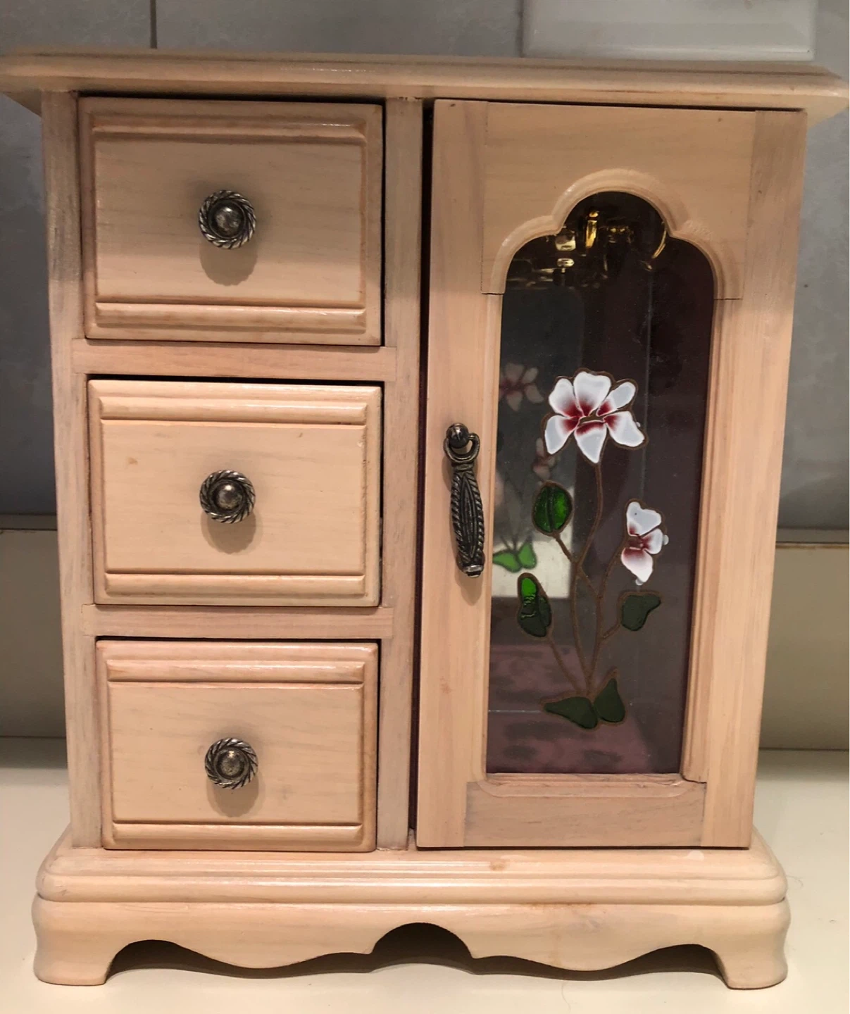 Light wood jewellery box featuring three drawers and a mirrored compartment with a decorative stained glass door. It has a rotating carousel for necklaces or bracelets. Measures approximately 9 inches wide.