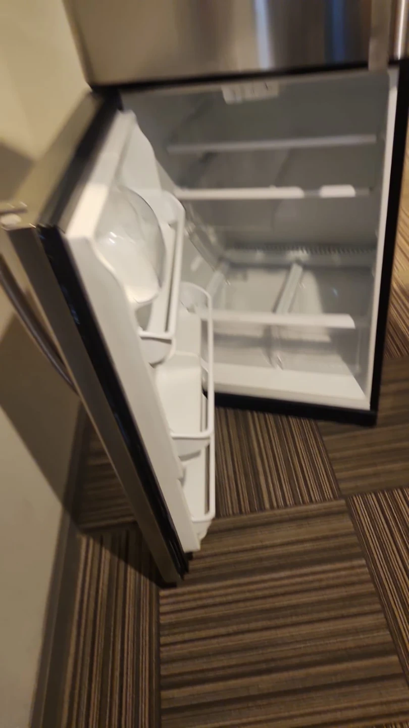 This Frigidaire refrigerator comes in a sleek stainless steel finish. It's a top-freezer model with adjustable shelves inside. Perfect for a small apartment or dorm room!