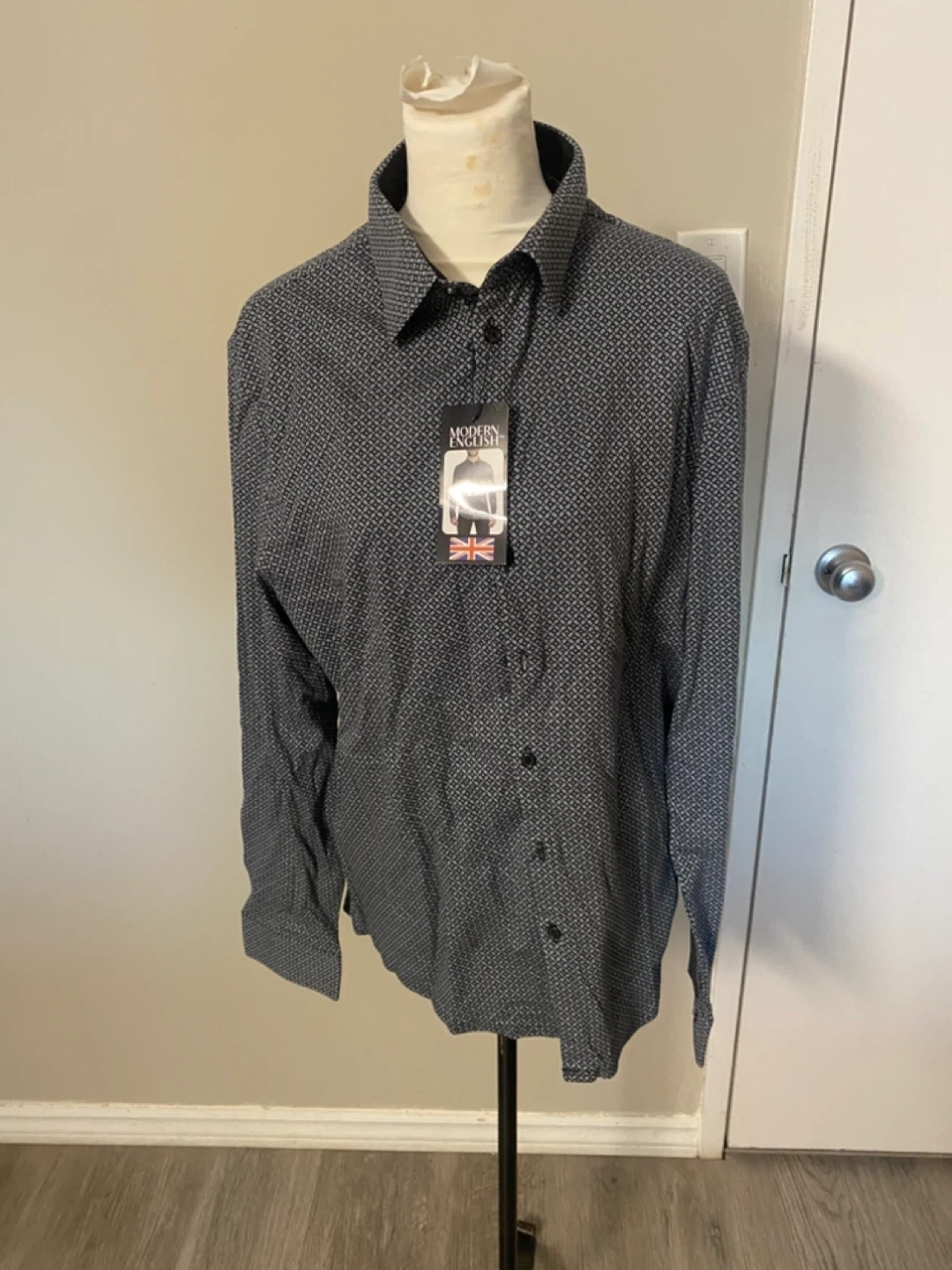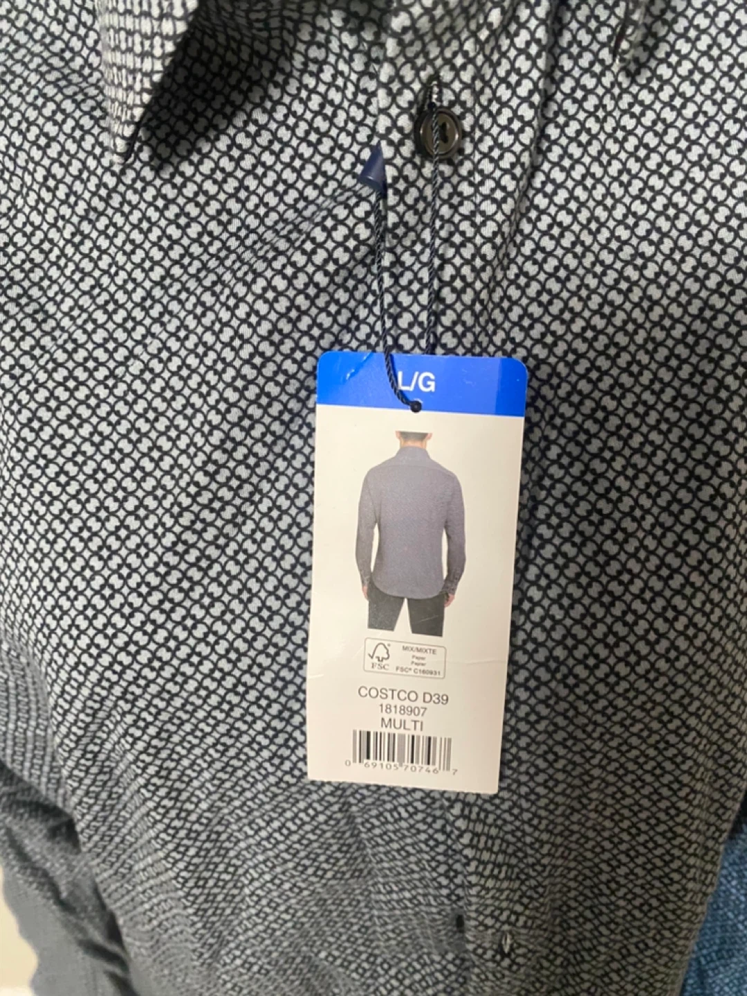 Brand new with tags Kirkland Signature men's long sleeve button-up shirt. Size is L/G. It features a dark grey and white geometric pattern. Fabric is a blend for comfort.