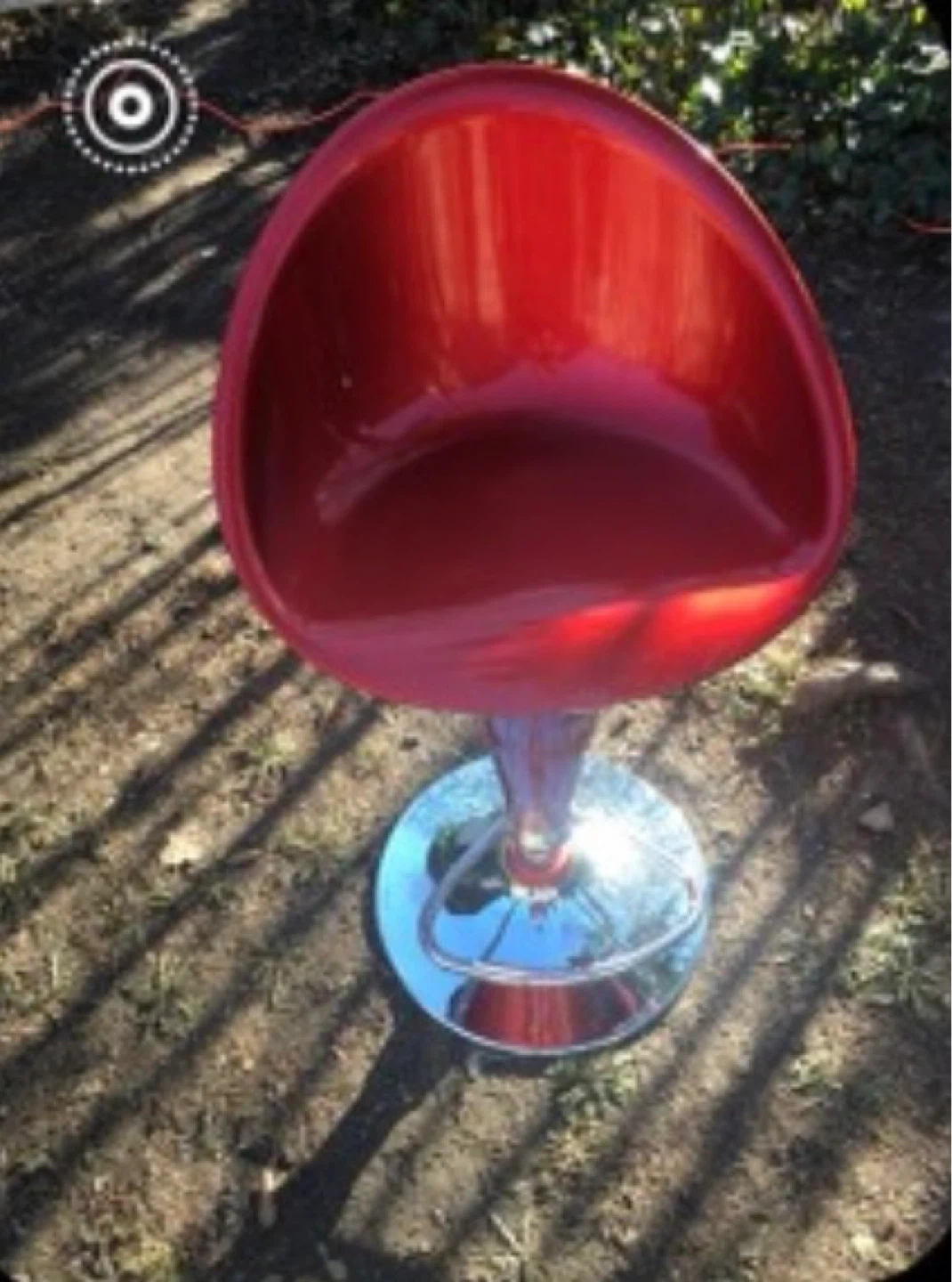 Shiny red bar stool with a chrome base. It's made of plastic and has a swivel function. This stool would be great for a home bar or kitchen island.