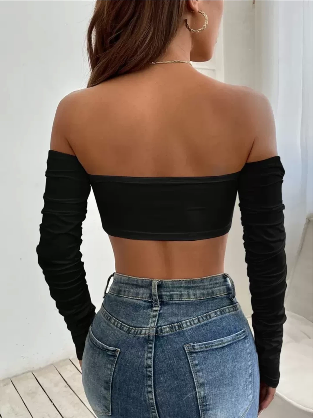 This black crop top features an off-the-shoulder design with long, ruched sleeves and a drawstring tie at the front.