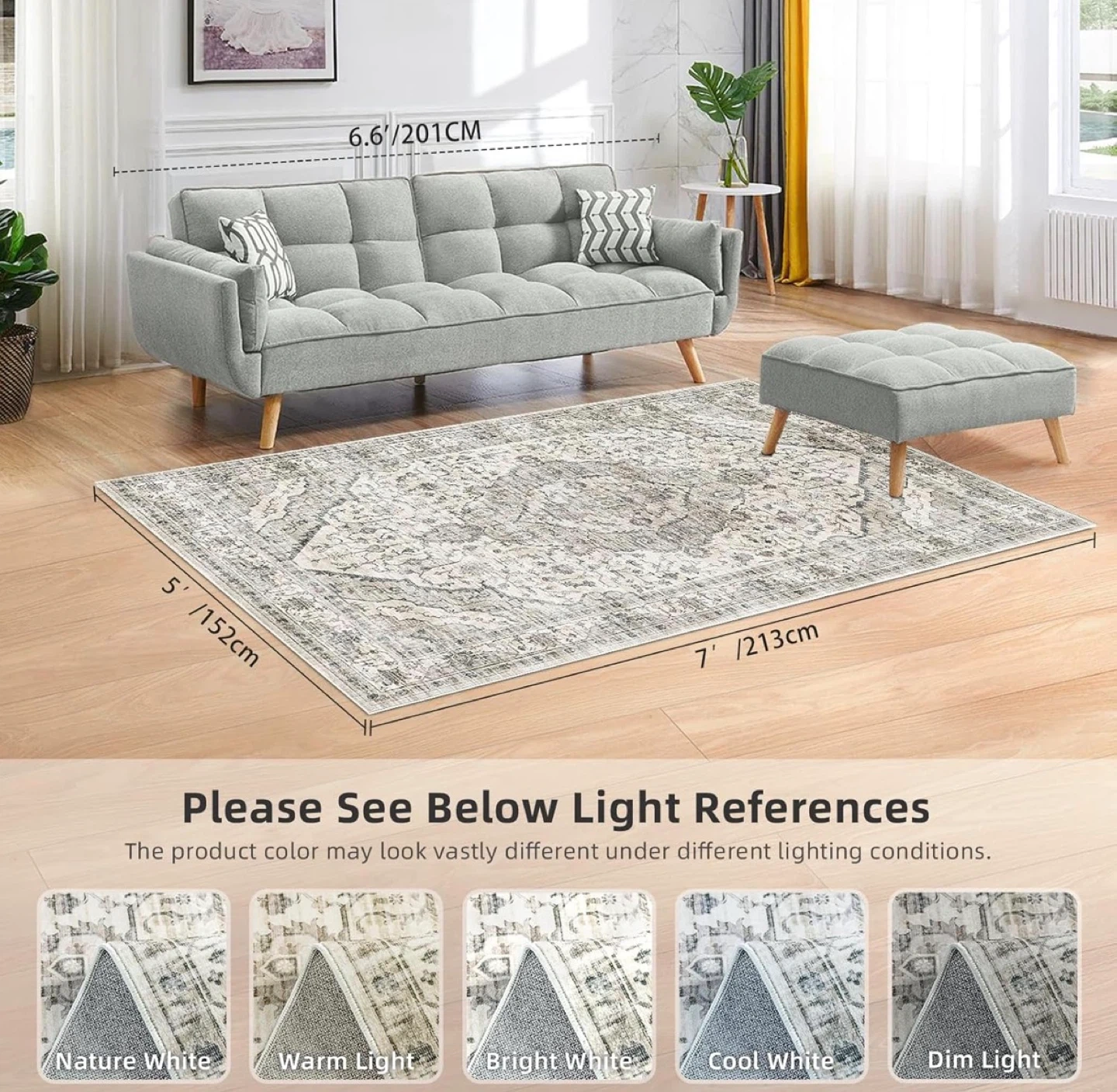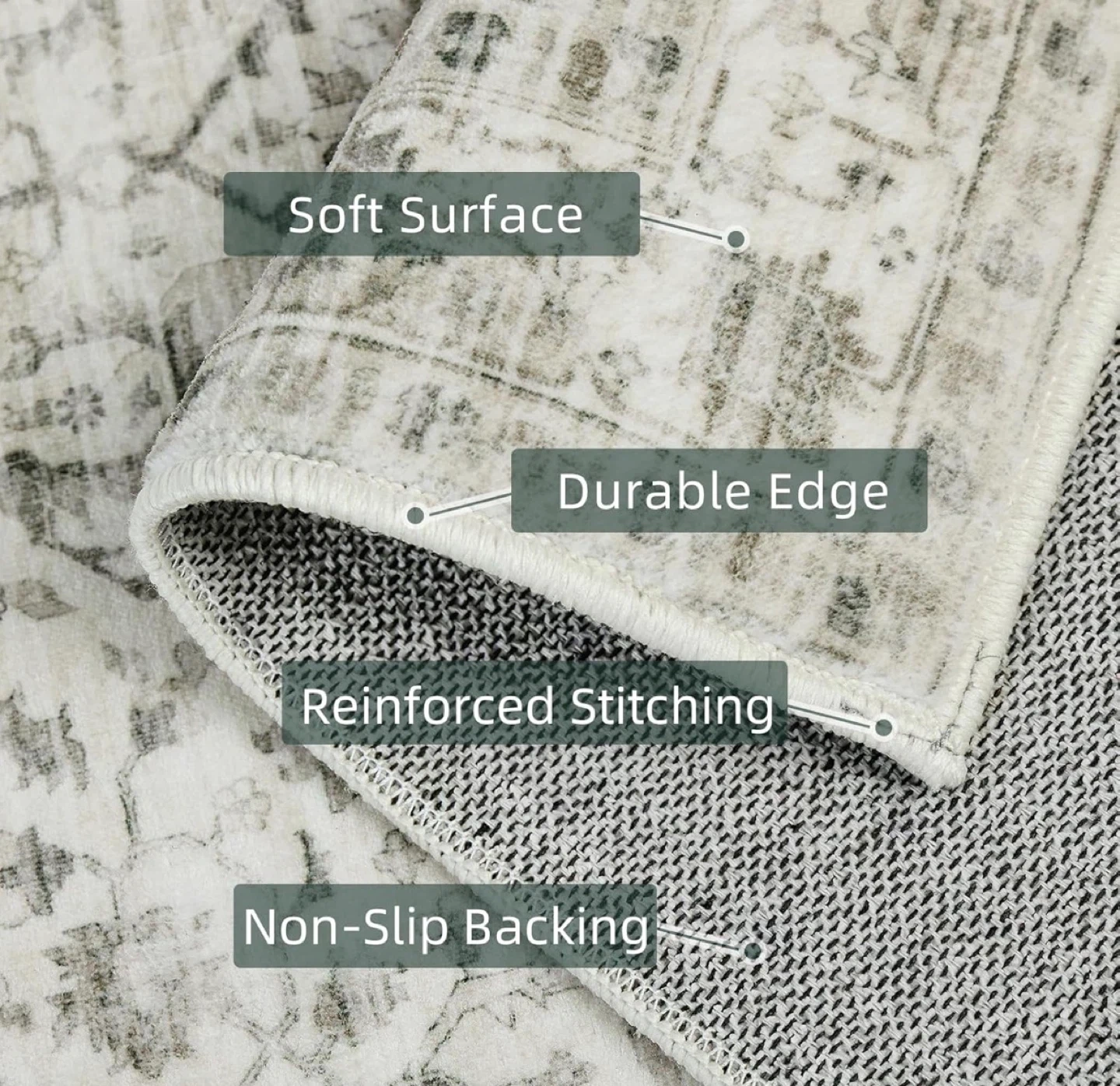 This 5' x 7' area rug has a soft surface and durable edge with reinforced stitching. It features a non-slip backing and is machine washable. Spot clean for easy care!