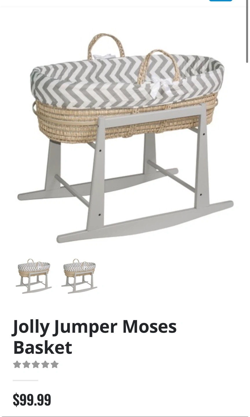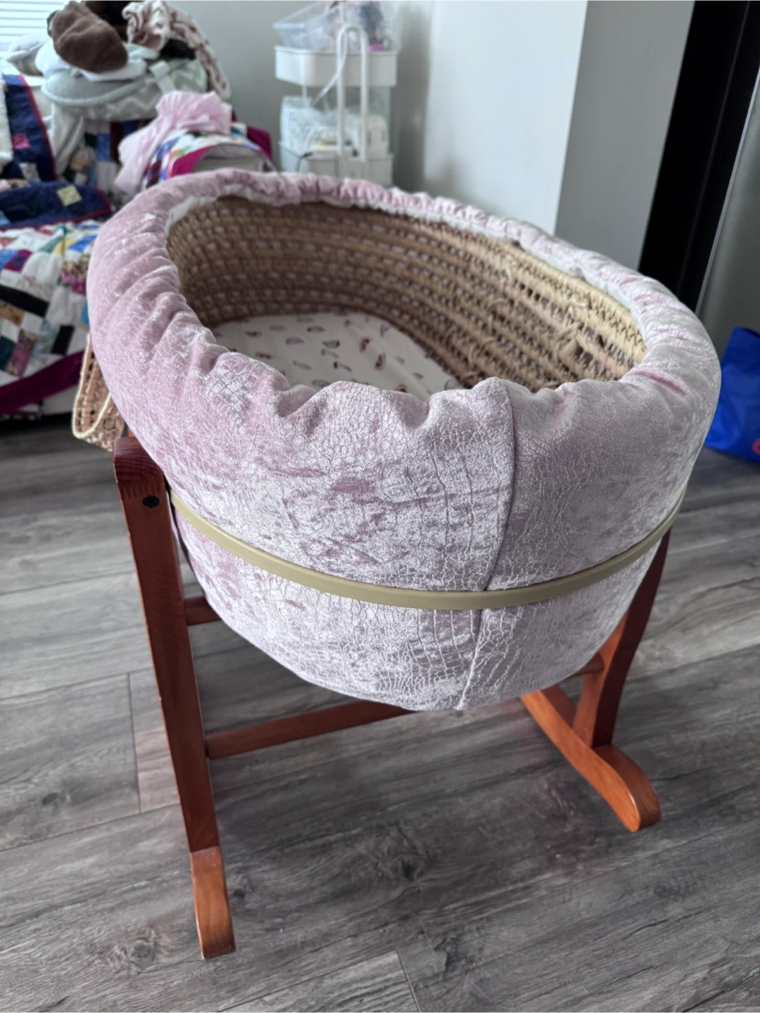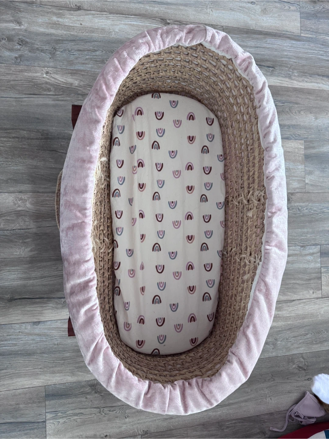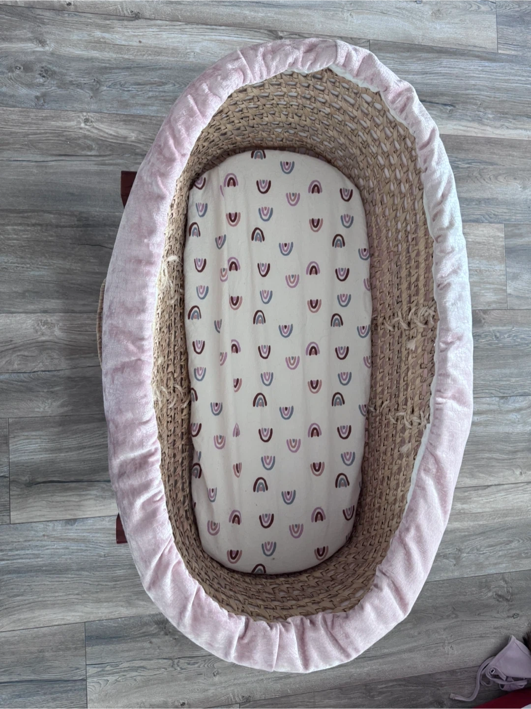 Moses basket bassinet with a woven straw base and pink velvet trim. It includes a fitted sheet with a rainbow pattern. Comes with a wooden rocking stand.