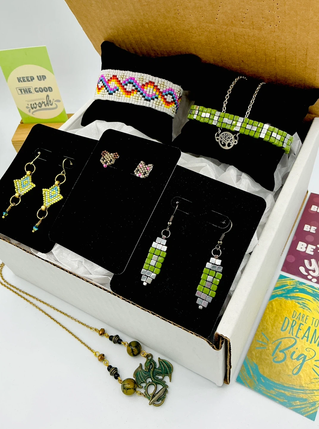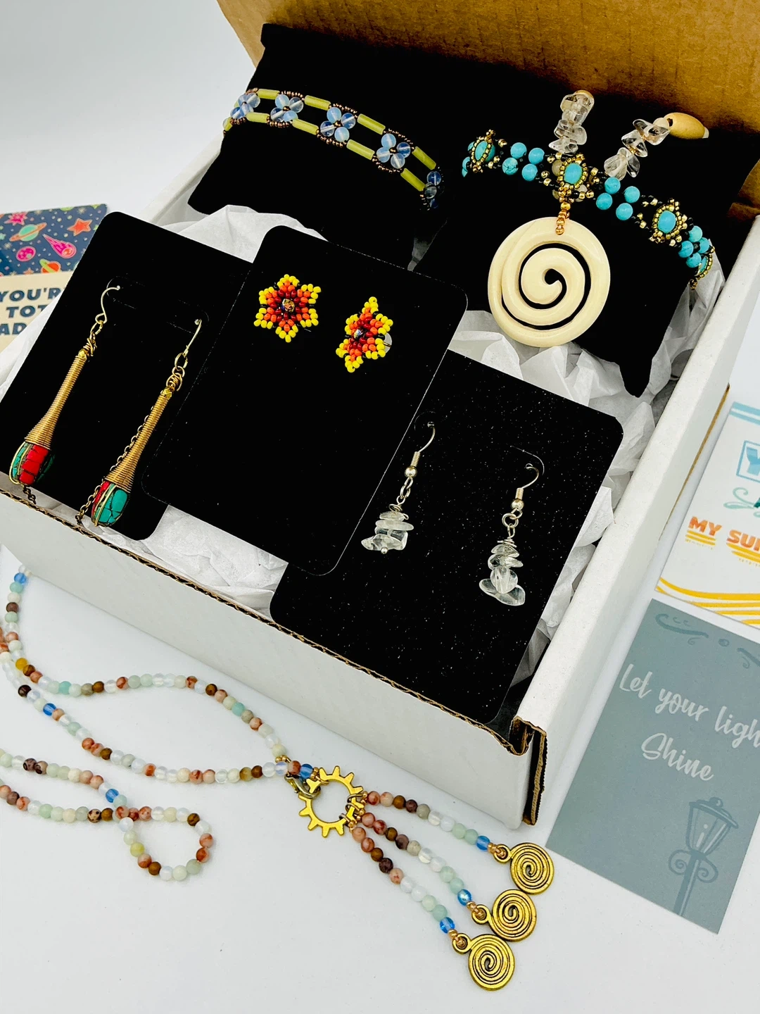 Handmade jewelry gift boxes in a variety of fun themes. Each box is curated and packaged as a ready-to-gift set.