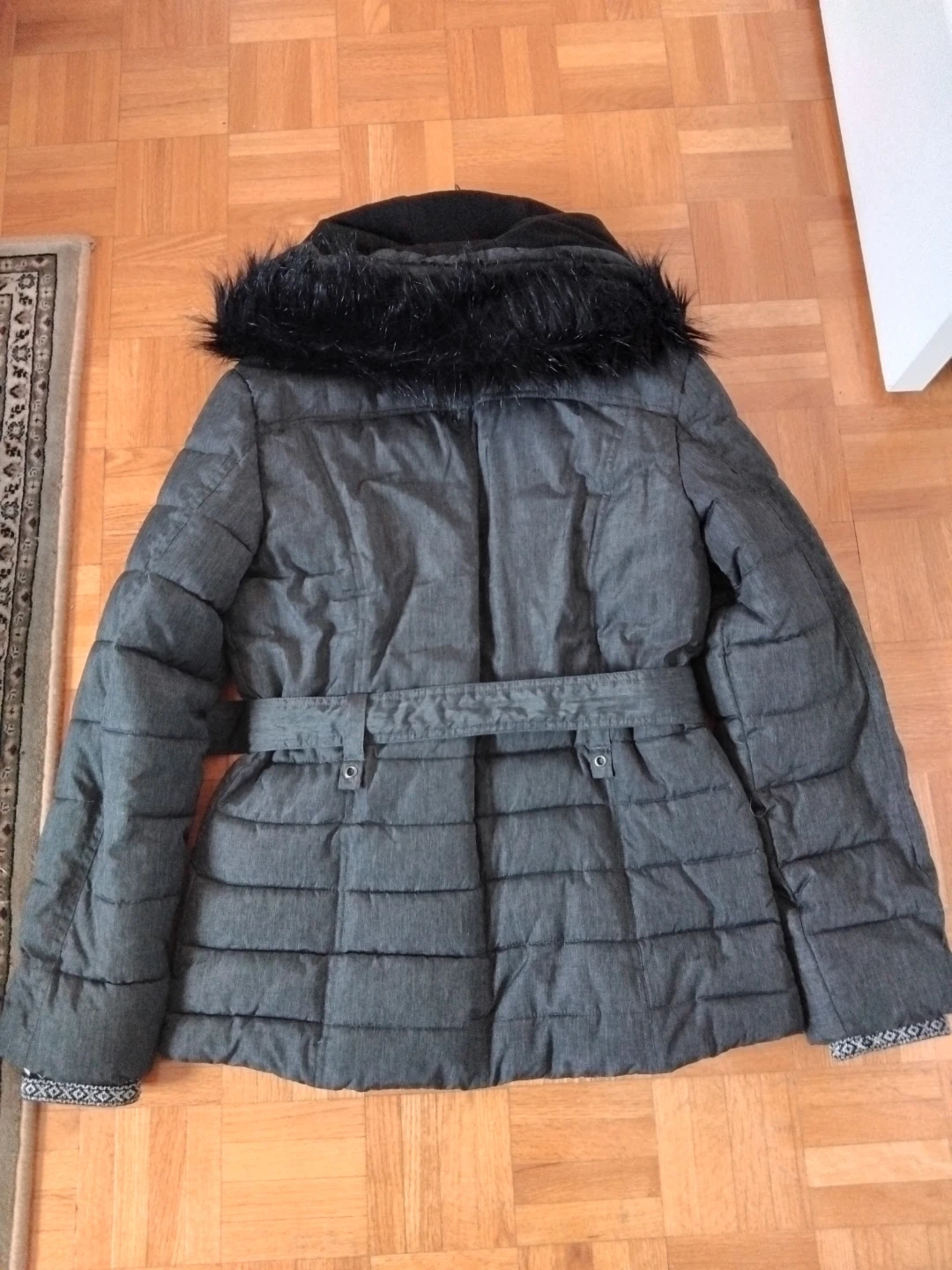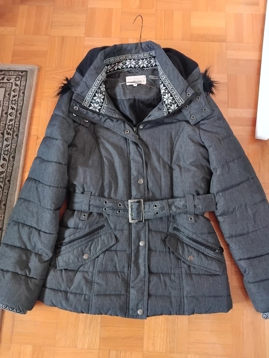 This puffer jacket is grey and features a belted waist. It's fully lined with a black satin material. The hood is trimmed with faux fur and has a decorative patterned trim around the collar. It's great for staying warm and stylish on colder days.