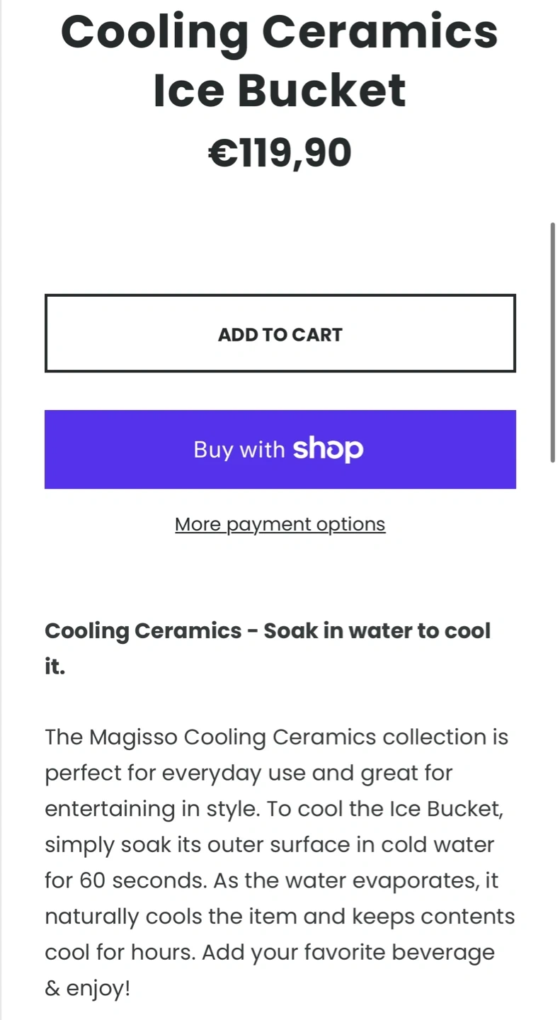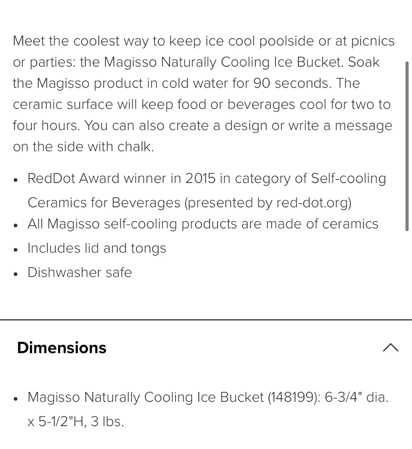 This Magisso ice bucket is made of naturally cooling terracotta. Designed by Simon Stevens. Dishwasher safe. Soak in water before use for optimal cooling. Holds ice to keep beverages chilled.