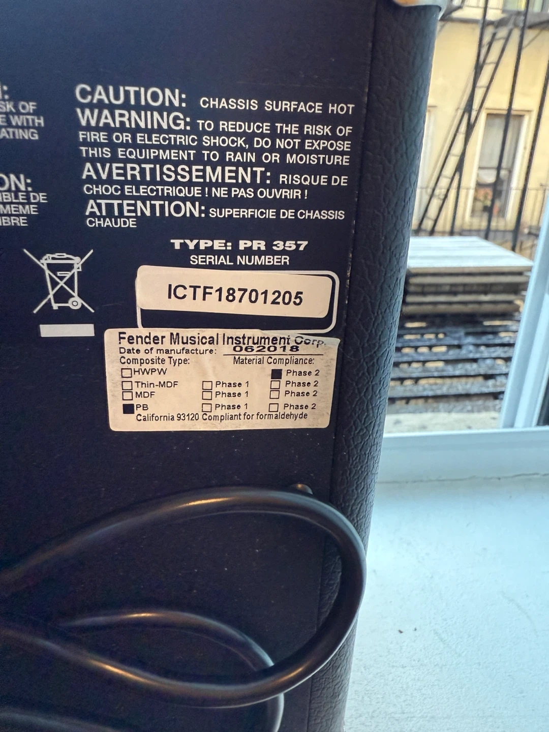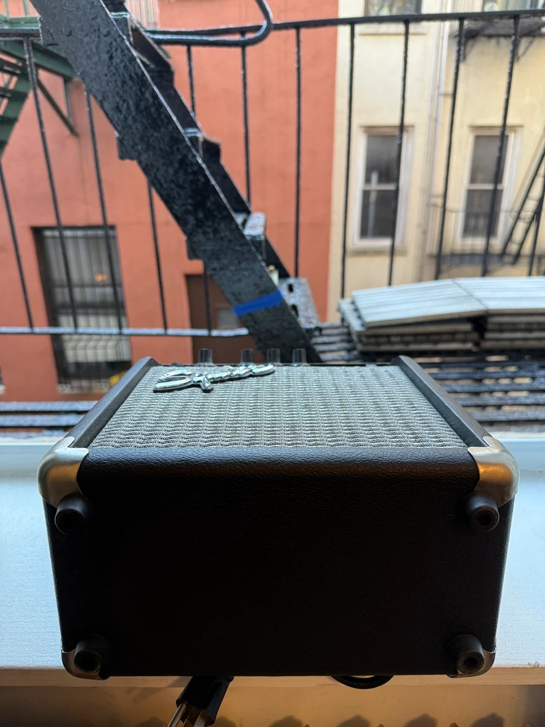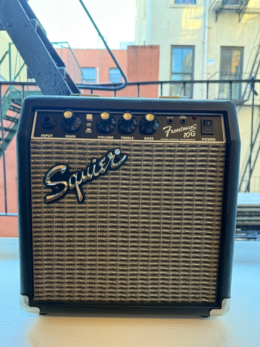 This is a Squier Frontman 10G guitar amplifier. It features input, gain, volume, treble, and bass controls. It also has an aux in and headphone jack. It's 10 watts and made in Indonesia.