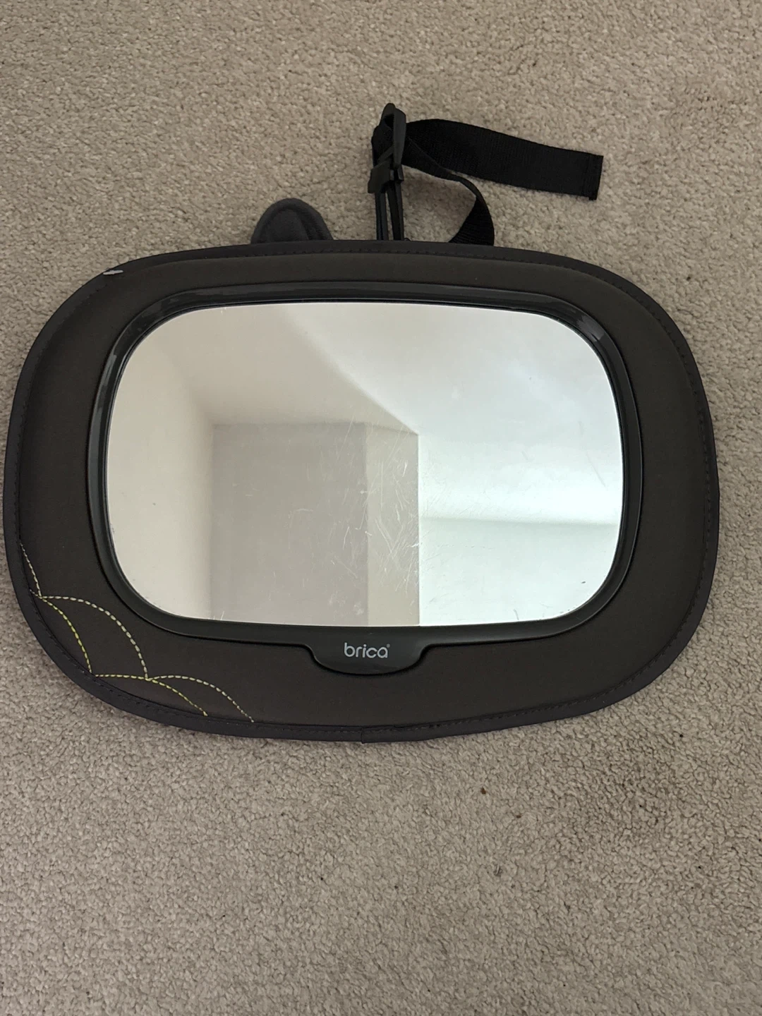 This Brica baby car mirror allows you to see your child in the back seat. It attaches easily to the headrest. The mirror is made from shatter-resistant acrylic.