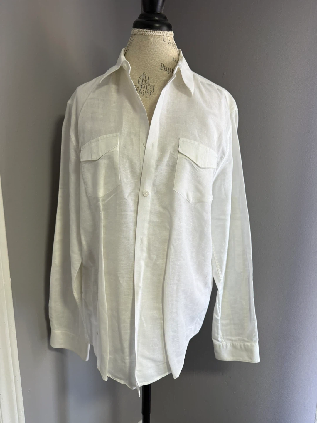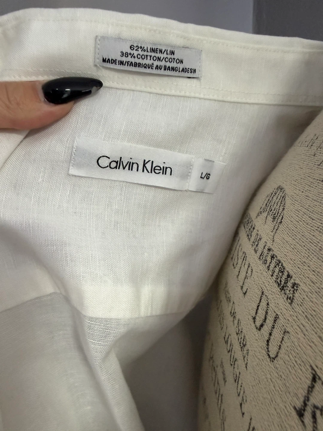 Calvin Klein button-up shirt in a white linen and cotton blend. It's a size large with two front chest pockets. Made in Bangladesh.