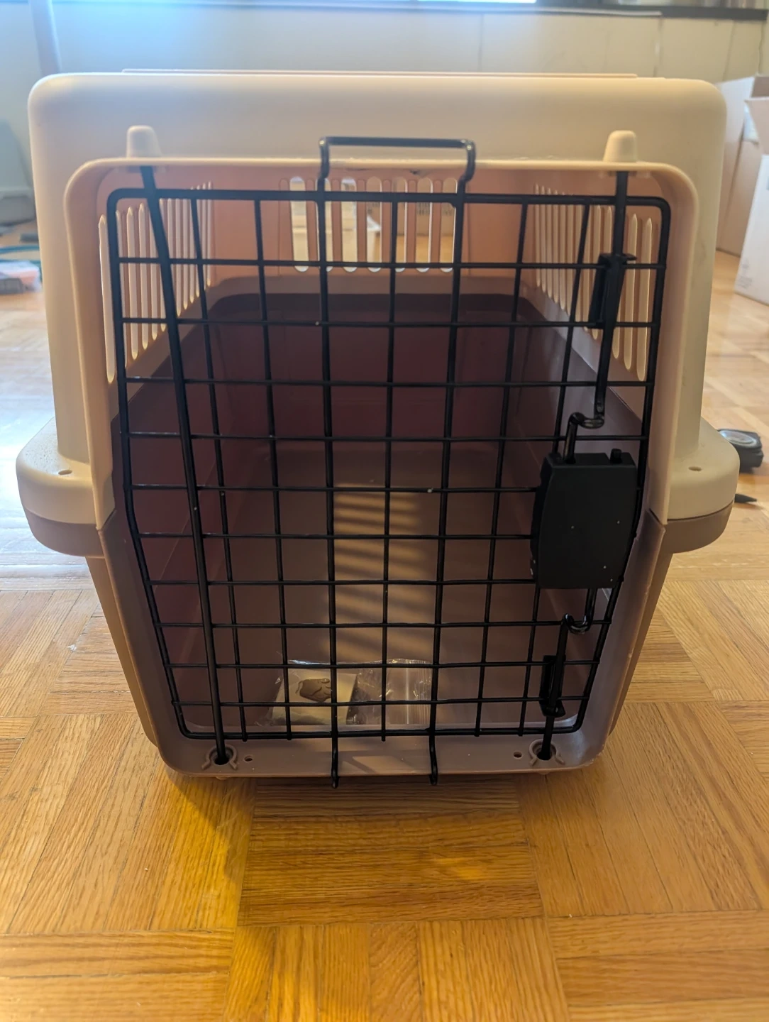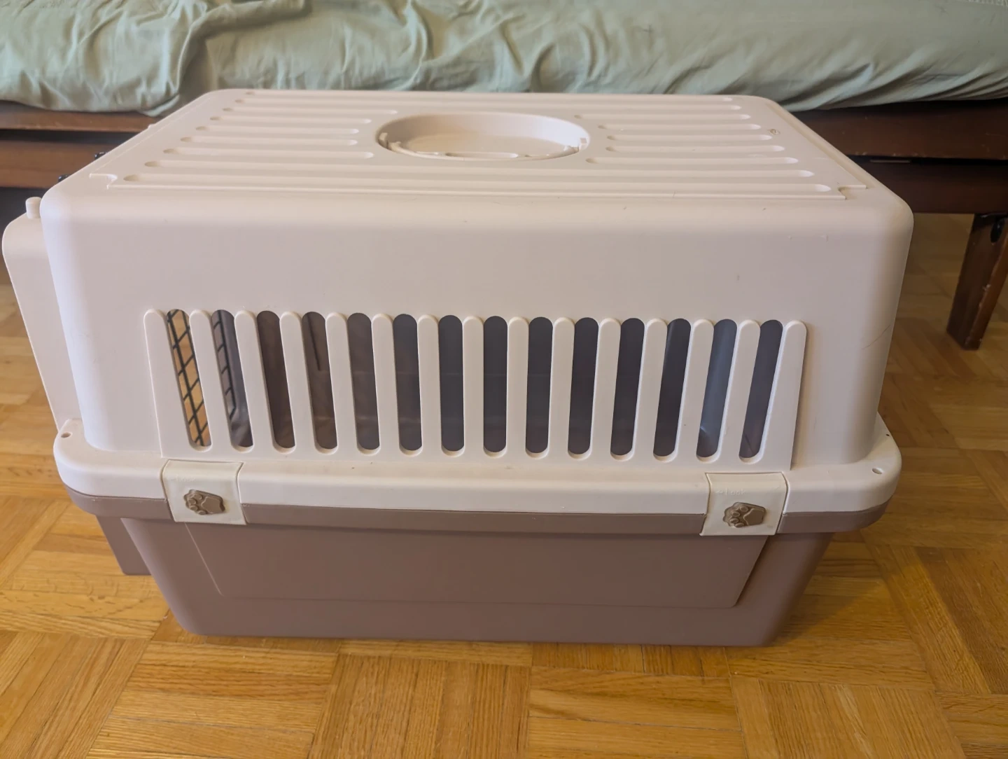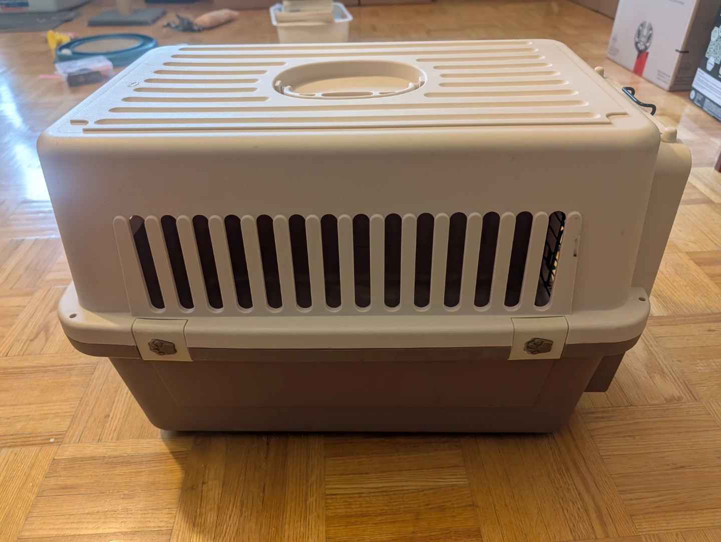 53 cm (L) x 30 cm (W) x 40 cm (H) pet traveler cage for sale. The cage is in good condition with no cracks and has been used for almost 10 years. It is easy to carry and suitable for small cats or dogs.