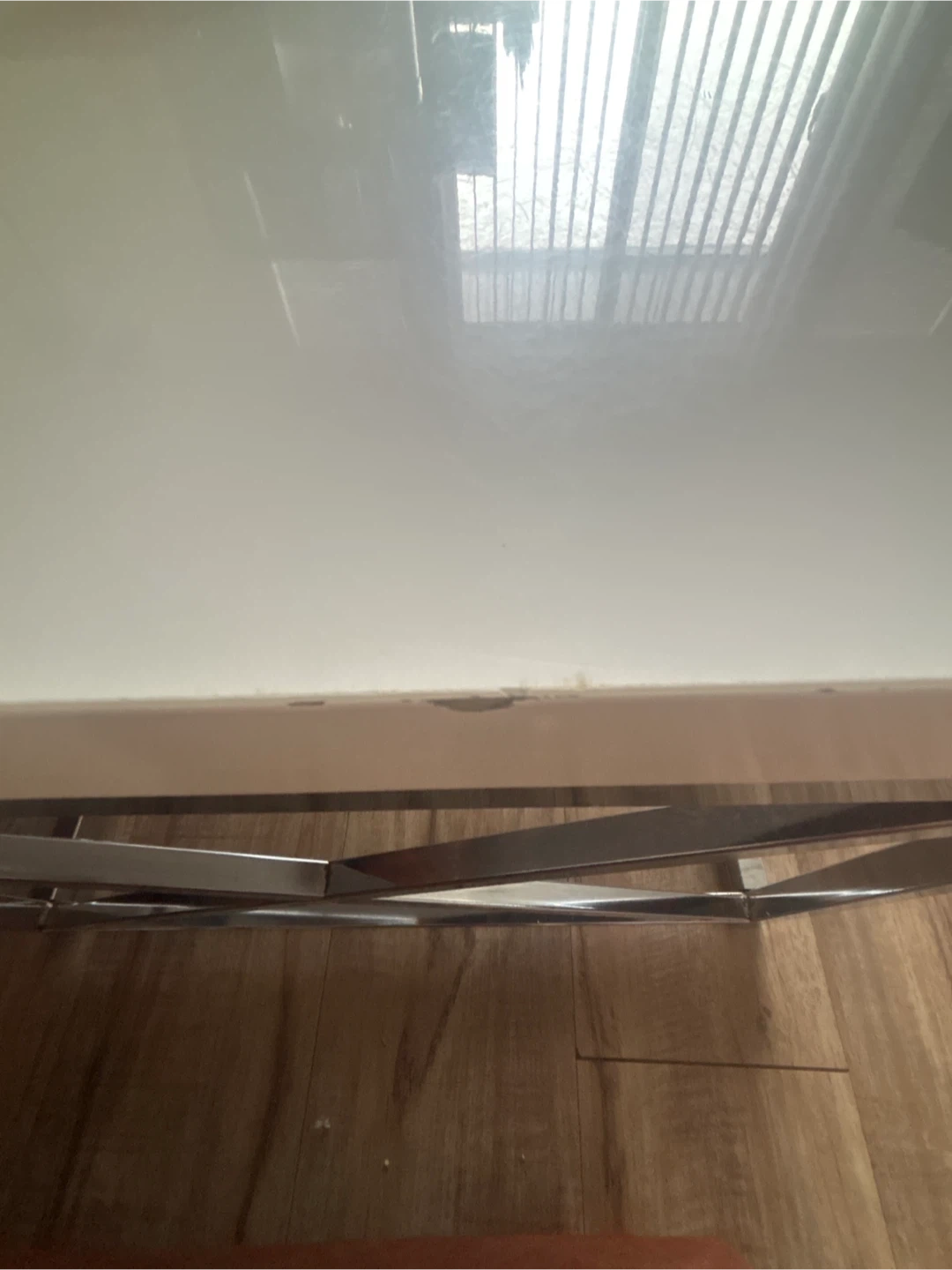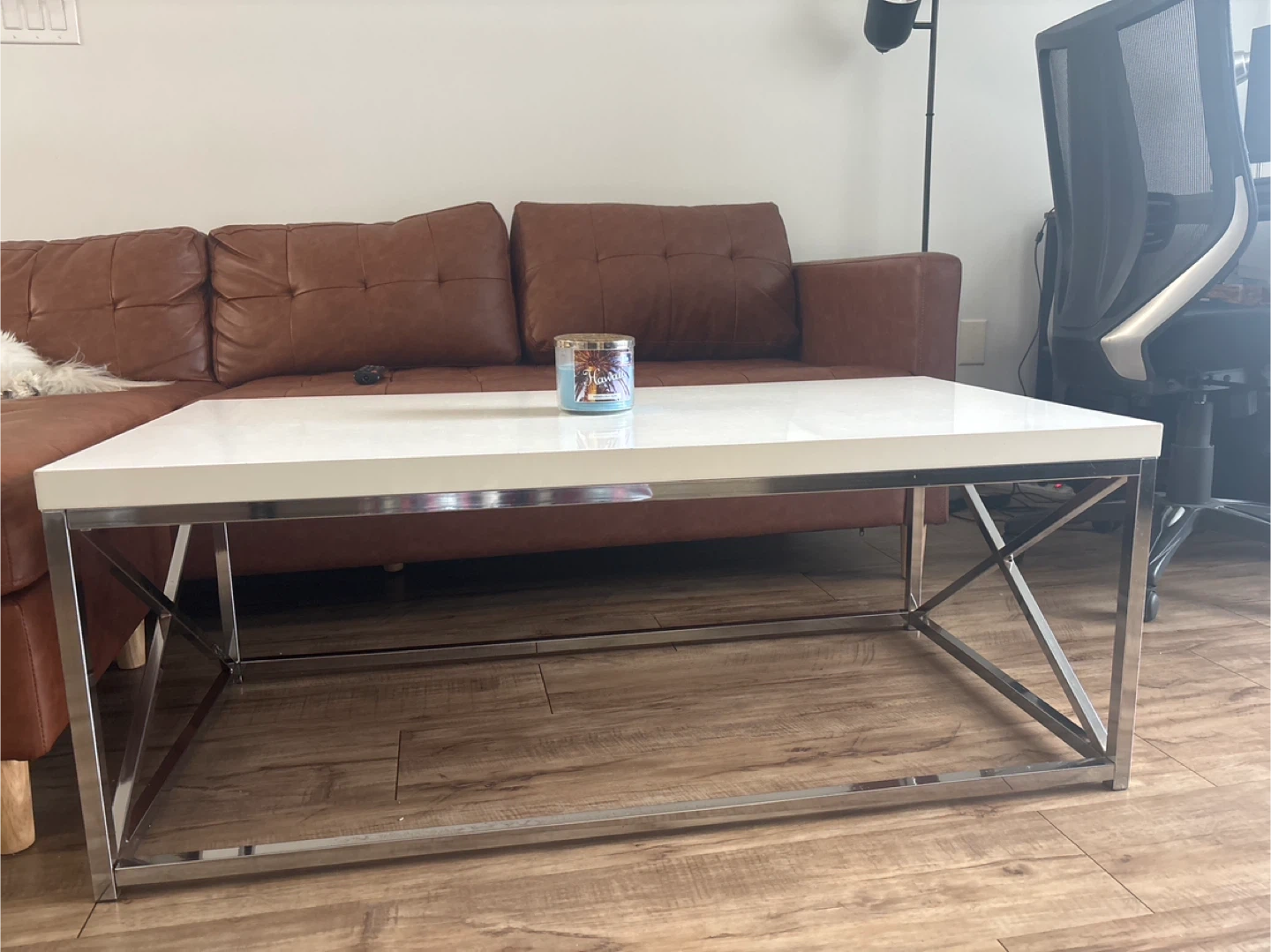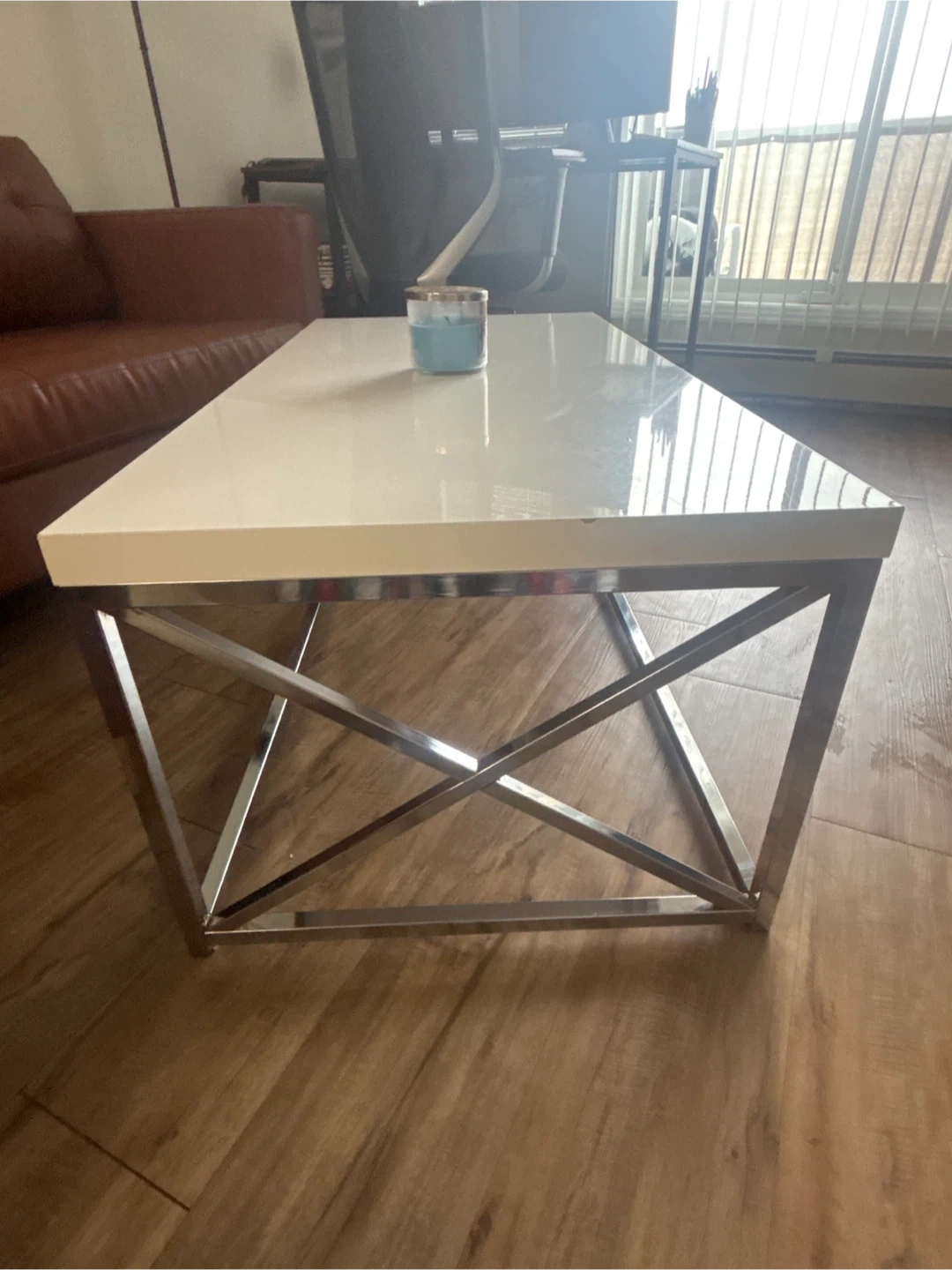 Selling a coffee table with a white top and chrome-coloured legs. There's a small chip on the edge, as shown in the photos. It's still a stylish piece for any living room!