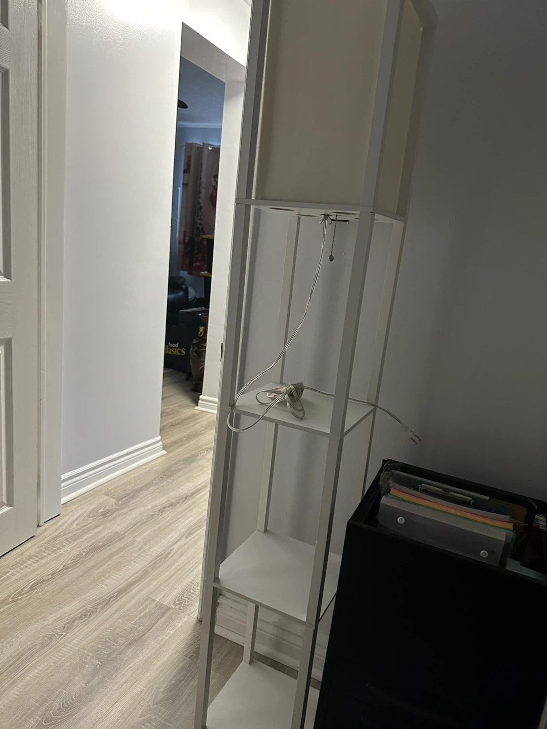 This is a white floor lamp with integrated shelving. It features a pull chain for light control. Dimensions are approximately 12 inches wide by 12 inches deep and 65 inches tall.
