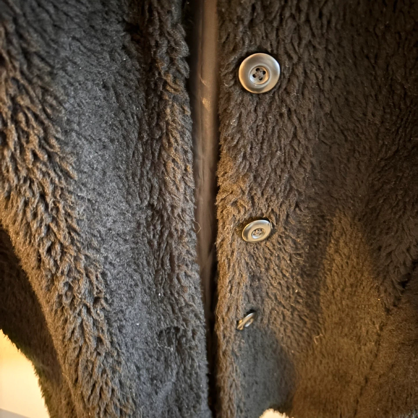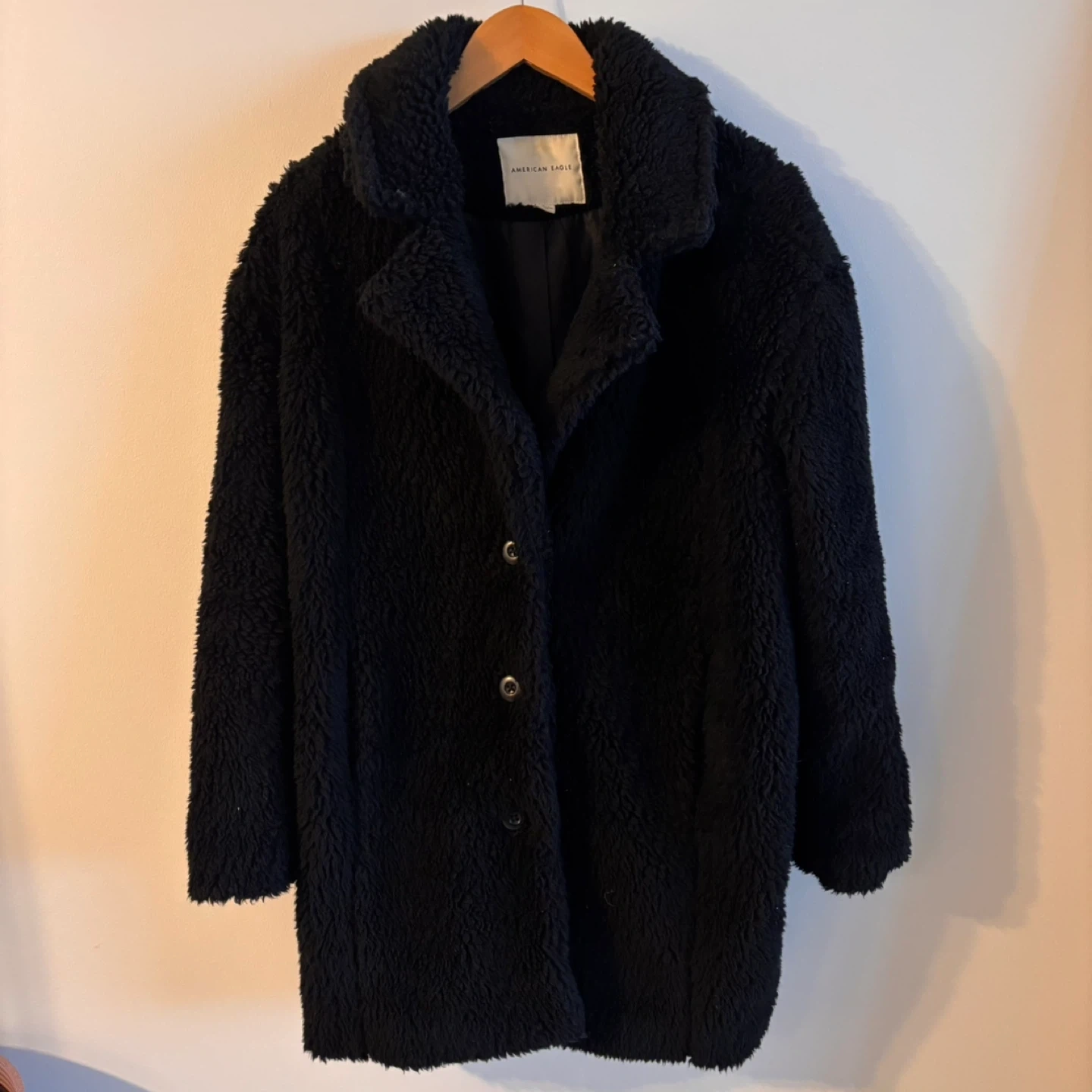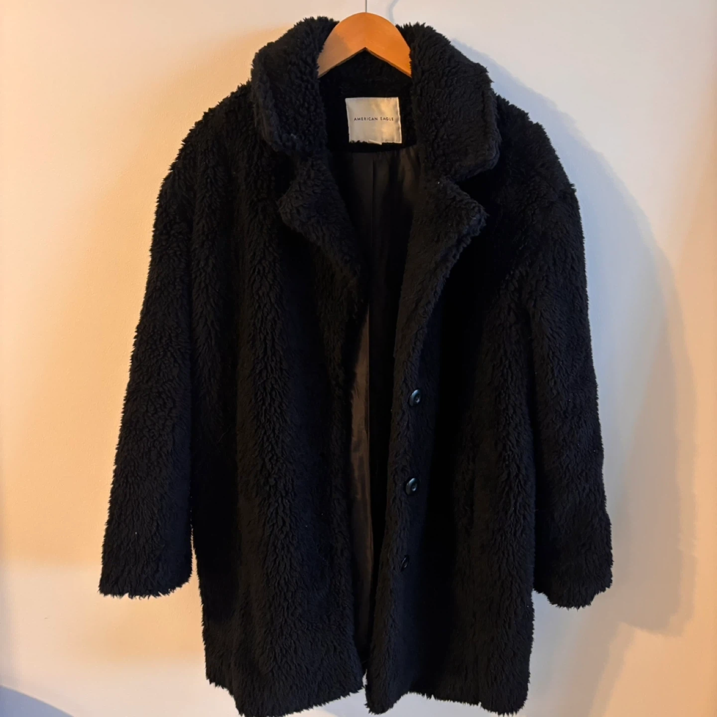 Comfy black teddy coat from American Eagle. It's a size small with a button-up front. Made with a soft, fuzzy material for warmth.