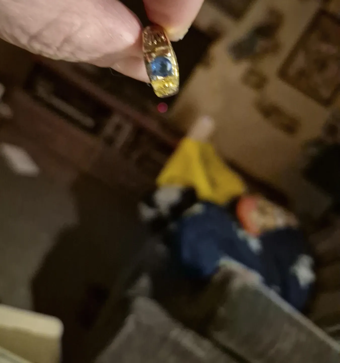 This is a gold-tone ring featuring a round blue stone. It has intricate detailing along the band. It's a lovely piece for any jewellery collection.