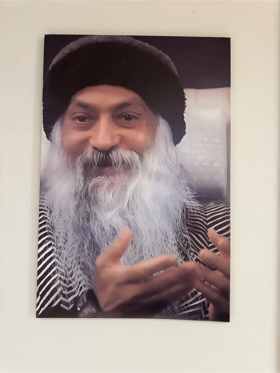 Poster featuring Osho, known for his spiritual teachings. This print captures his distinctive appearance and gestures. It's a piece for those interested in his philosophy.