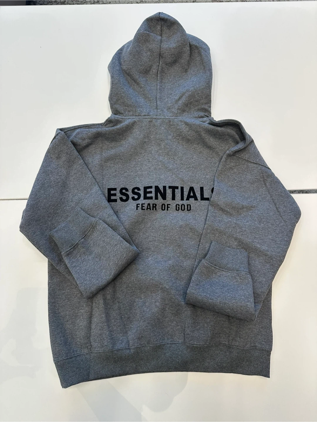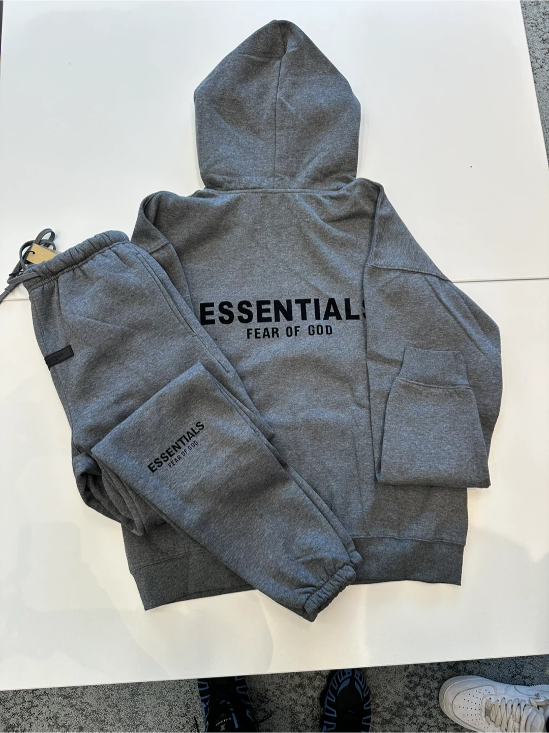 Grey hooded sweatshirt and matching sweatpants set from Fear of God Essentials. Both pieces feature embroidered "ESSENTIALS FEAR OF GOD" logo detail. This comfortable set is great for casual wear.