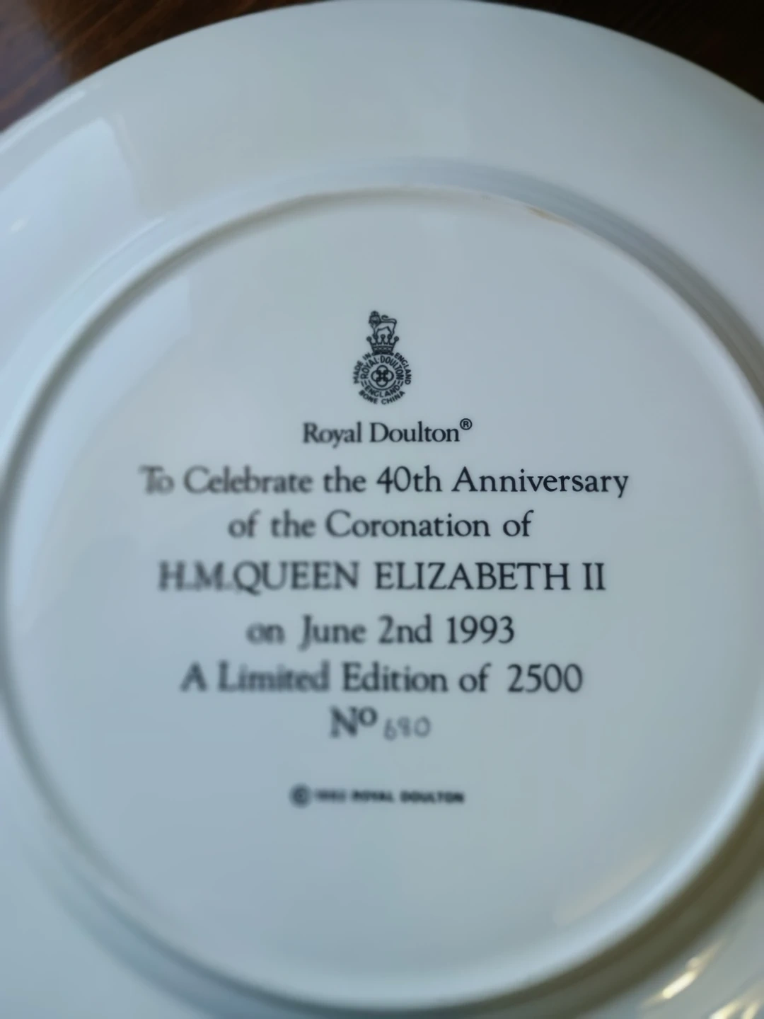 Royal Doulton plate celebrating the 40th Anniversary of H.M. Queen Elizabeth II's Coronation on June 2nd, 1993. Limited edition of 2500, this is number 680. Porcelain material.