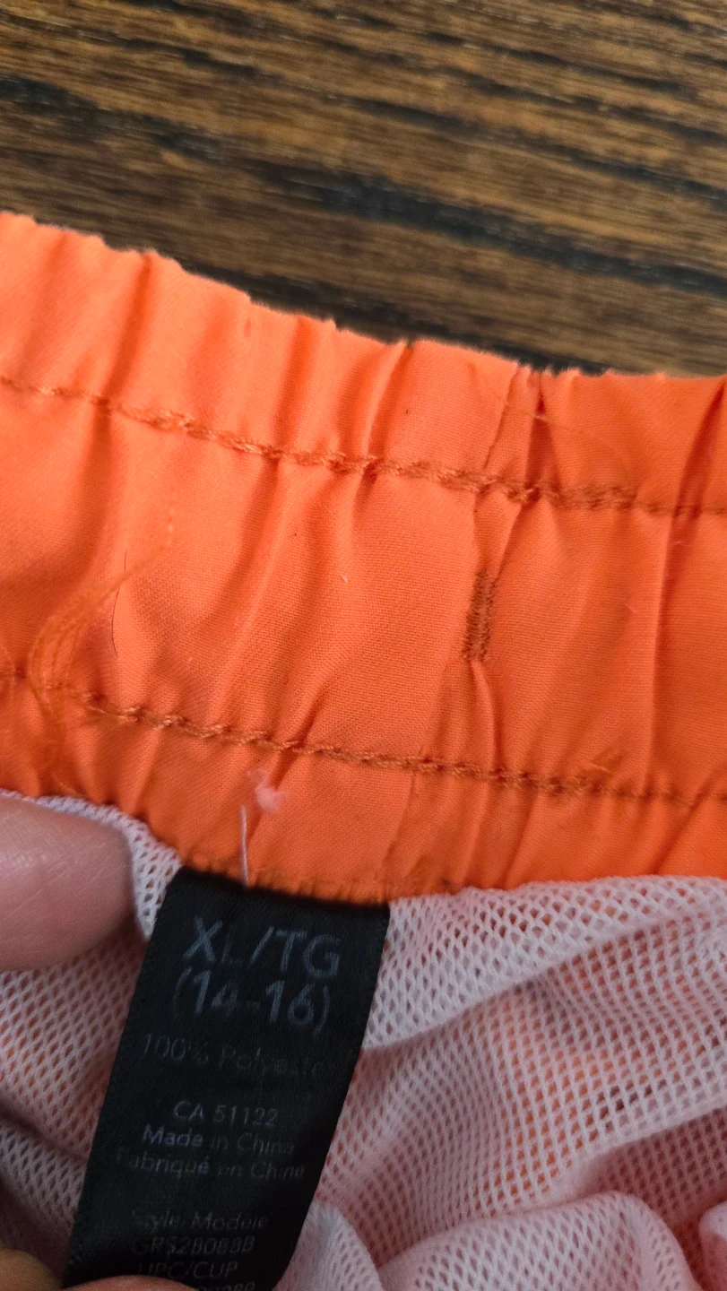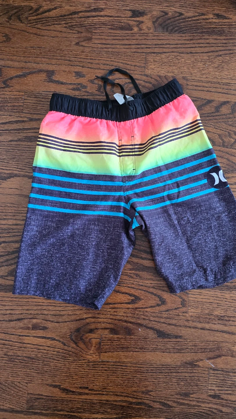 Bundle of three pairs of boys' swim trunks. Includes one pair of Hurley brand trunks with a colourful striped design and a black base. Also includes pair of Nautica brand orange trunk, one with a side graphic. Both brands are size 14/16. Great for summer fun!