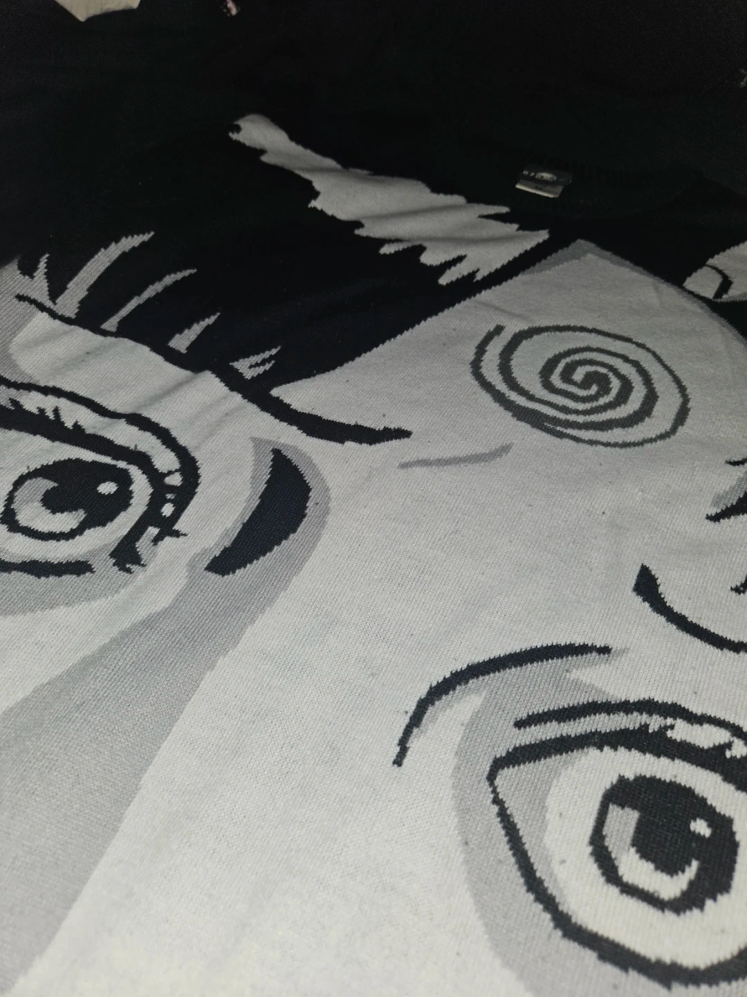 This Uzumaki sweater features a bold graphic from Junji Ito's work. It's made of a knit material. A great piece for fans of horror manga!