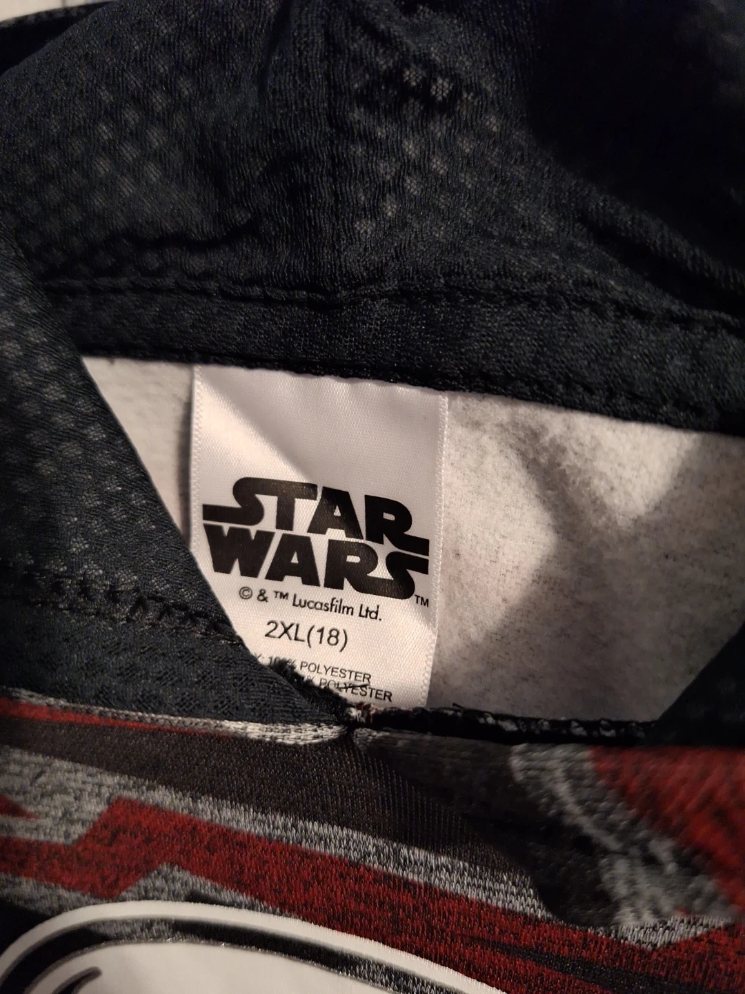 This Star Wars hoodie features a cool Stormtrooper graphic on the front. It's a youth size 2XL and made of polyester. Perfect for any young Star Wars fan!
