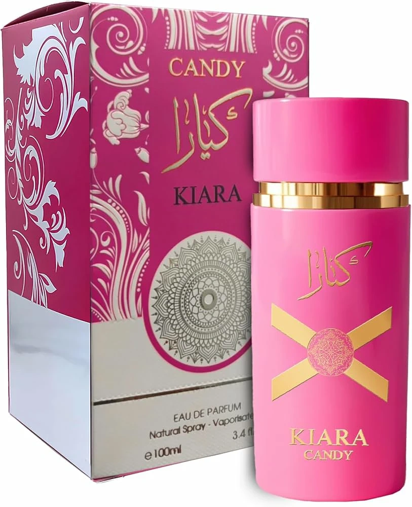 This is Kiara Candy Eau de Parfum Natural Spray. It's a 100ml bottle. The fragrance is presented in a vibrant pink bottle with gold accents, matching its decorative box. This perfume is suitable for anyone who enjoys a sweet and fruity scent.