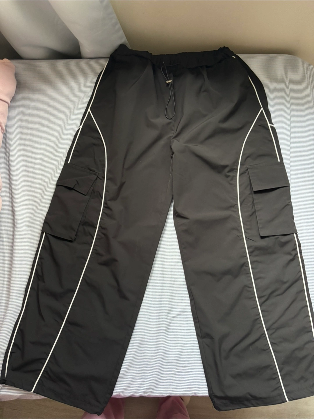 Black cargo pants, wide leg. Features white piping detail. Elastic waistband with drawstring. Two side cargo pockets.