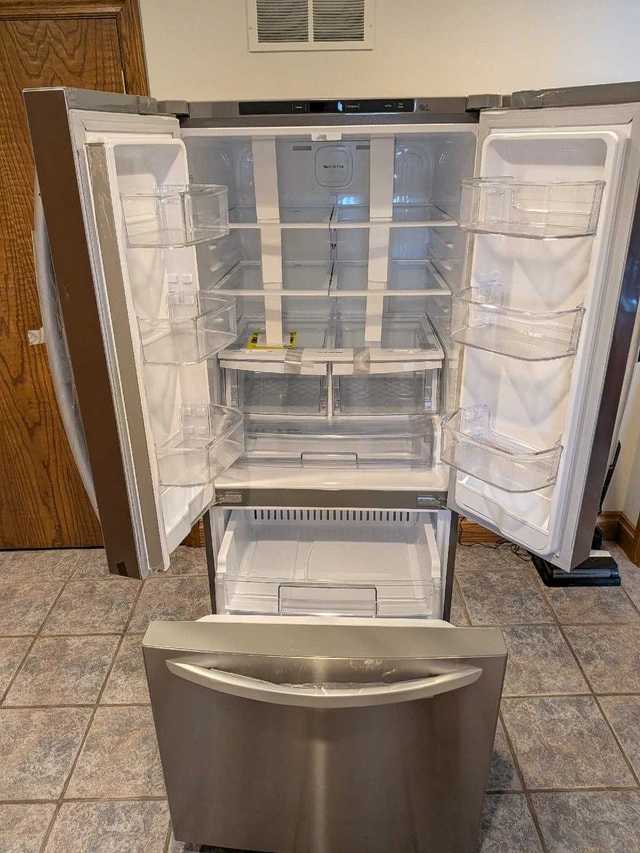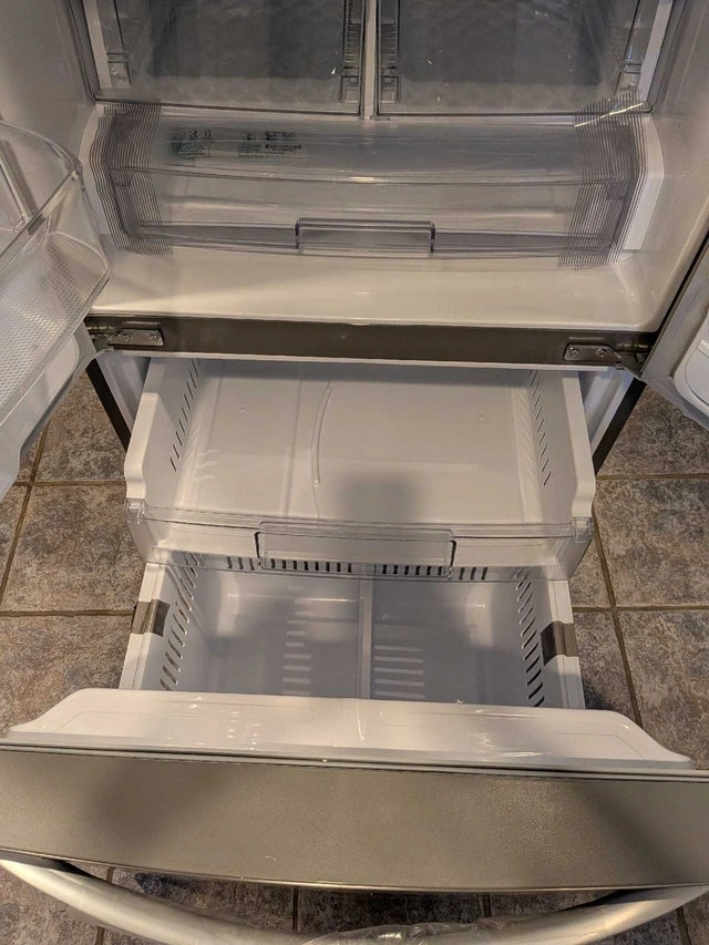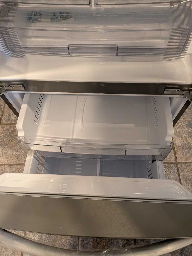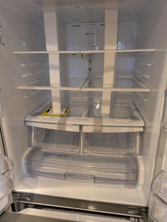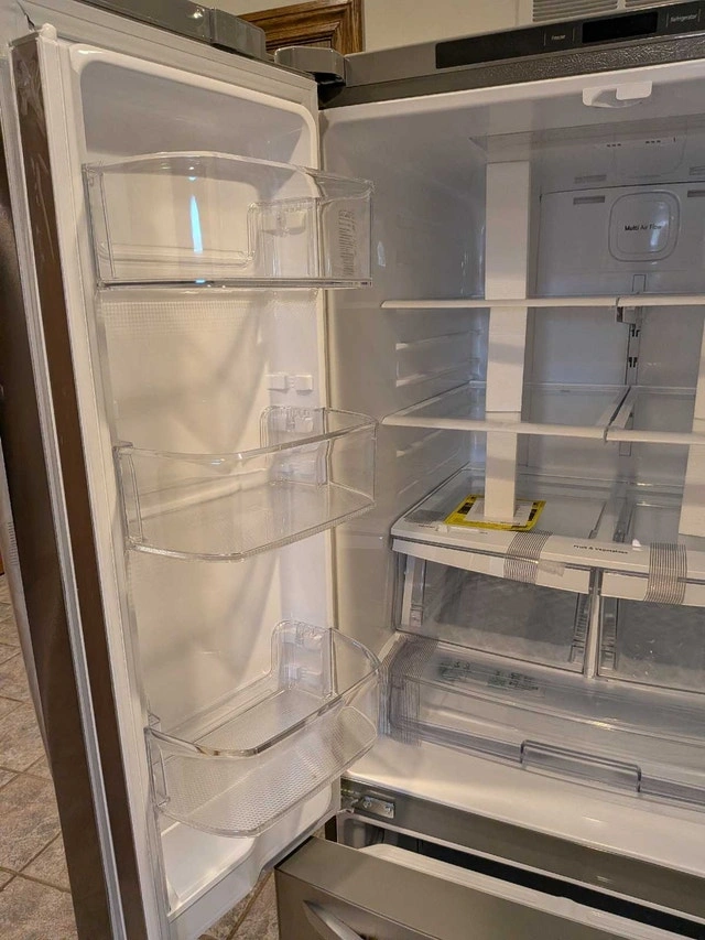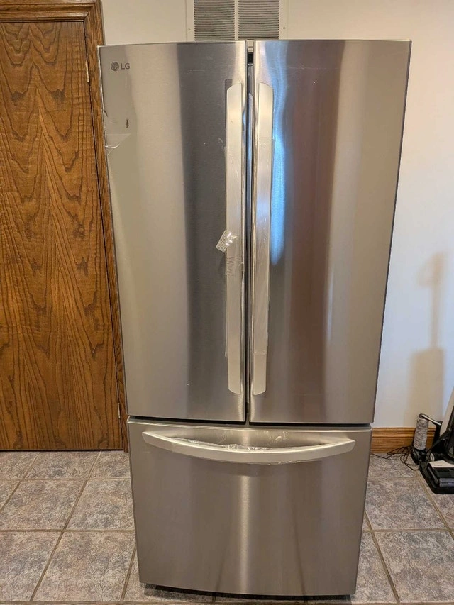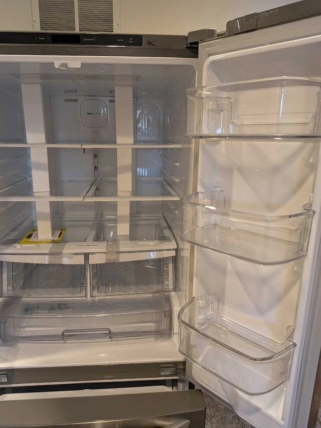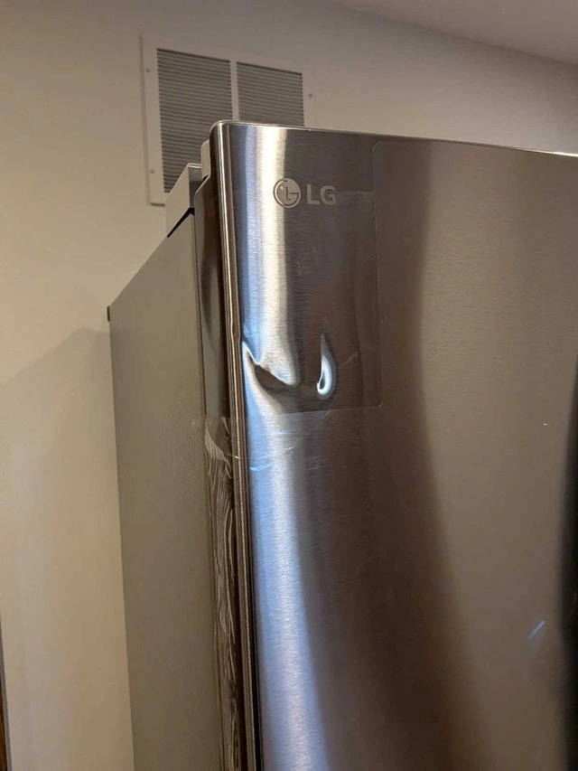 Brand new, never used LG fridge. Unfortunately, it was the wrong size for our kitchen, and we couldn't return it. It's in perfect condition with the original plastic wrap still on in most areas. There's one small dent on the top left corner, but it doesn't affect the fridge's functionality at all. This model features an Inverter Linear Compressor for quiet and efficient cooling, a Smart Cooling Plus™ System with multiple sensors for ideal temperature and humidity, and a Multi-Air Flow™ System for even cooling. It also has SmartDiagnosis™ technology for easy troubleshooting, ENERGY STAR® certification, and LoDecibel™ Quiet Operation. The interior includes Spill Protector™ tempered glass shelves, a Glide N’ Serve® drawer, a DuraBase™ solid freezer drawer, and bright LED lighting. It offers 21.8 cu. ft. total capacity (14.5 cu. ft. fresh food, 7.3 cu. ft. freezer) in a 30" wide footprint. The finish is smudge-resistant stainless steel with matching commercial-style handles. Other features include humidity-controlled crispers, a full-width deli drawer, multiple door bins, gallon door storage, frost-free operation, a door alarm, and child lock function. It's ADA compliant and uses standard 120V household power. Dimensions are approximately 29 3/4" W x 68 1/2" H x 35 1/2" D. Original price was over $1590+ tax. Message to view.