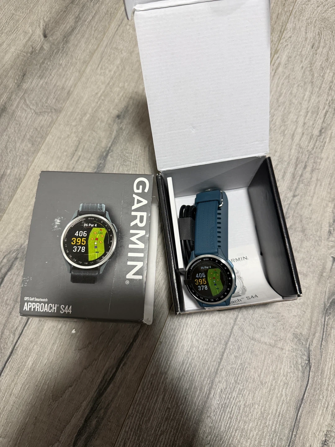 Garmin Approach S44 GPS golf smartwatch. Includes charging cable and original box. Teal band. This watch is designed for golfers to track their game.