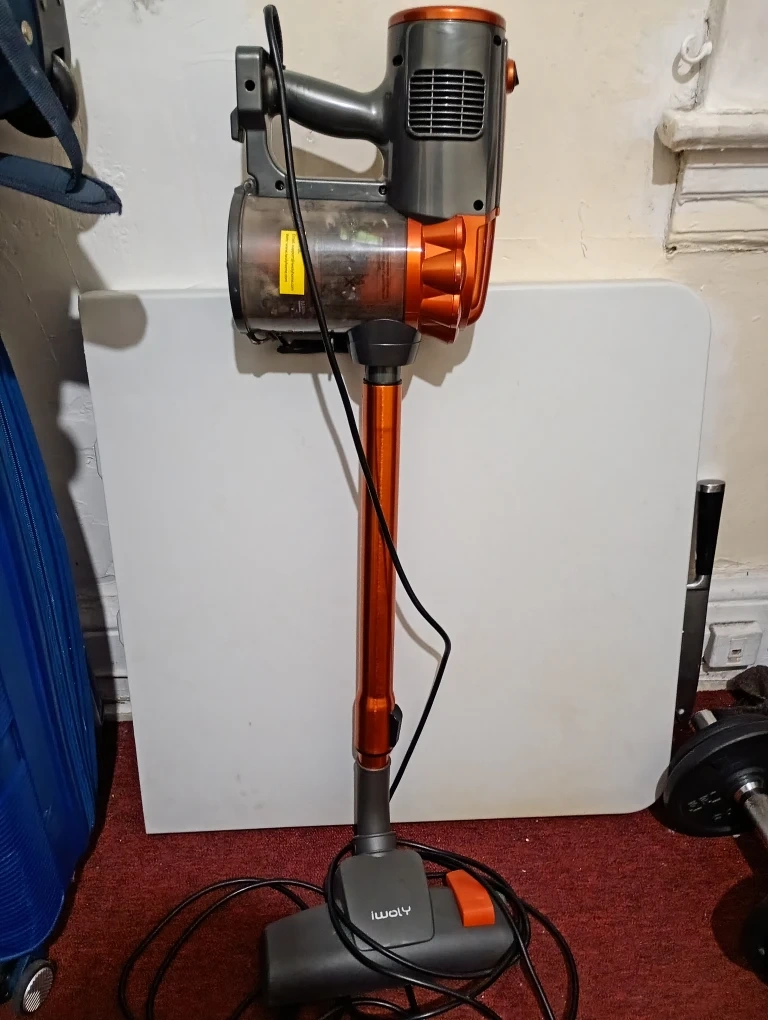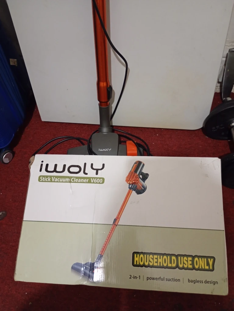 This is an Iwoly Stick Vacuum Cleaner V600. It features a bagless design and powerful suction. Household use only.