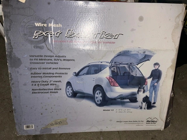 Selling a MidWest Wire Mesh Pet Barrier, great for keeping pets safe in the rear of your vehicle. Model 13, dimensions 31-70"W x 31-50"H. Non-reflective black electro coat finish. In great condition and ready to use. Cash accepted.