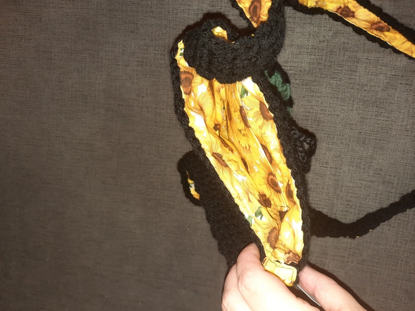 Strap: The bag has a black crocheted strap with a yellow, patterned fabric lining visible underneath.