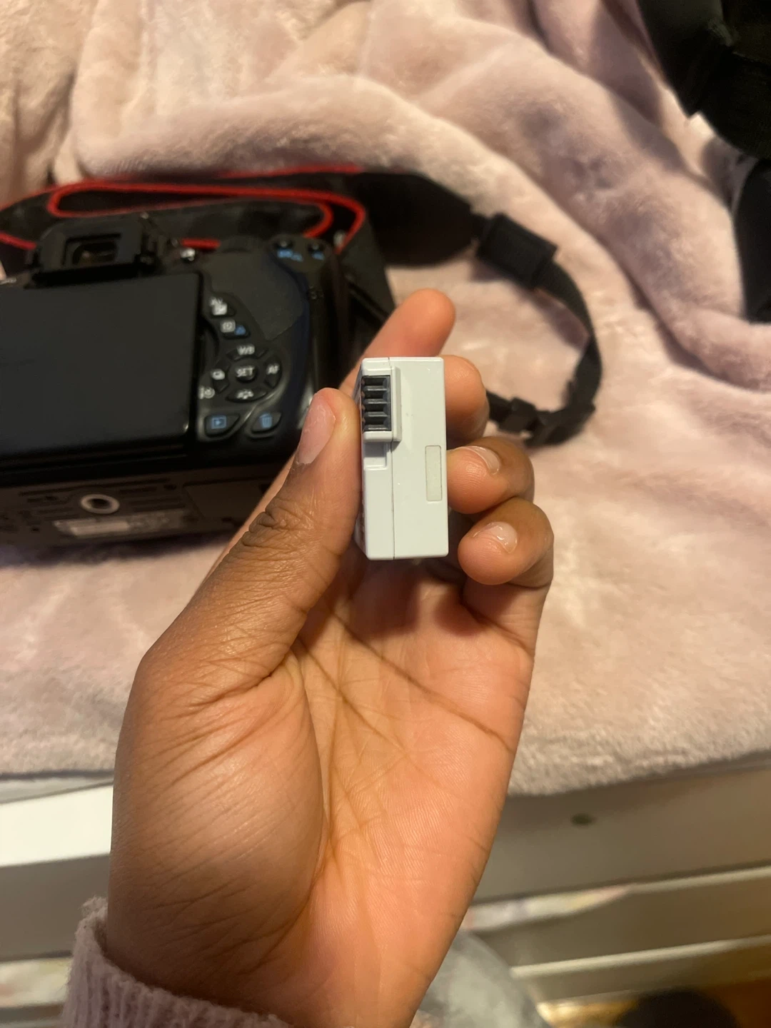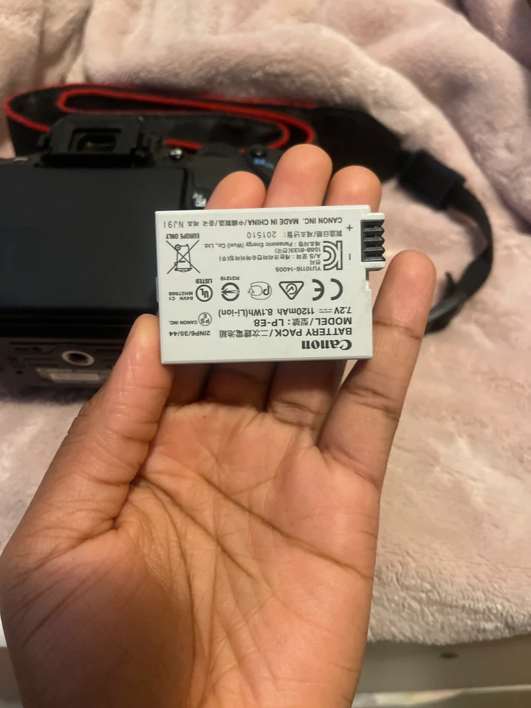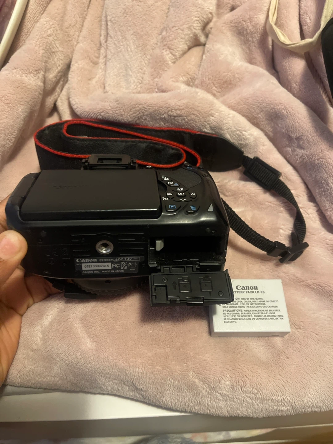 This is a Canon EOS Rebel T4i DSLR camera. It comes with a Canon LP-E8 battery pack and a neck strap. The camera has a flip-out screen for easy viewing.