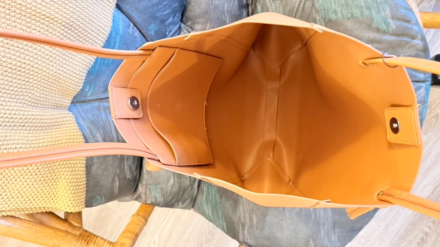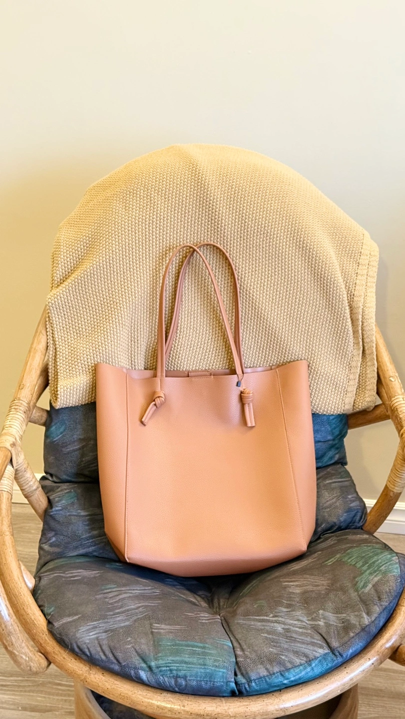 Stylish tote bag. Features two top handles and a small interior pocket. Neutral colour, perfect for everyday use.