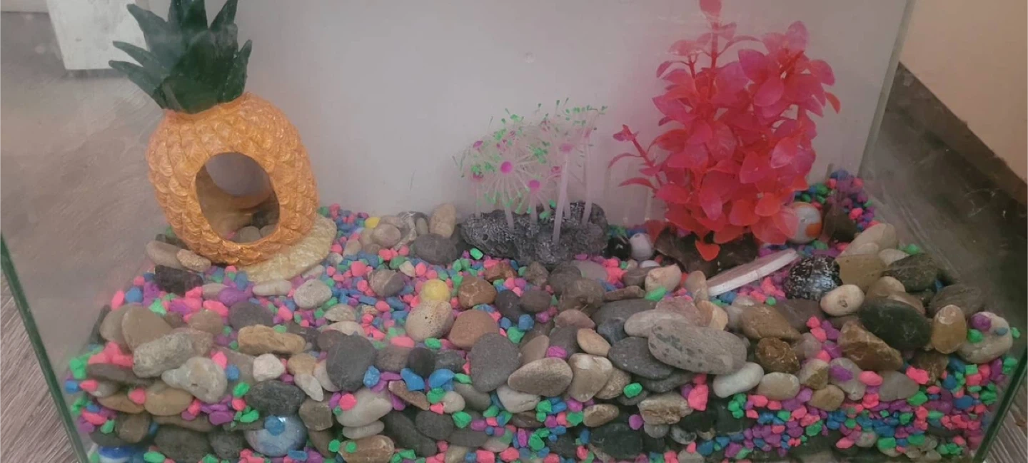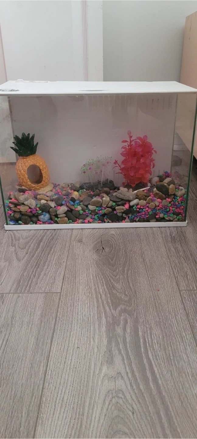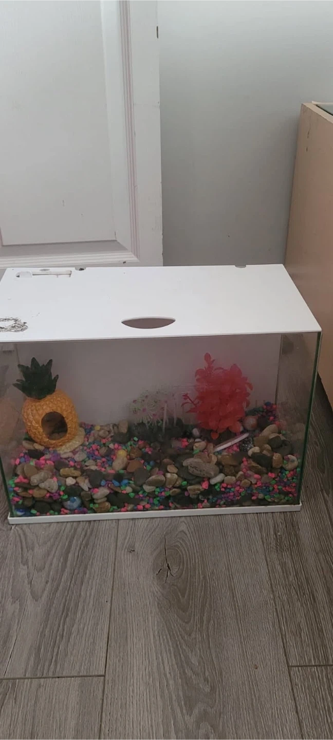This is a 3-gallon Top Fin aquarium with light. It includes colourful gravel, a pineapple decoration, and two artificial plants. Glass construction with a white lid. Hydrochange technology.