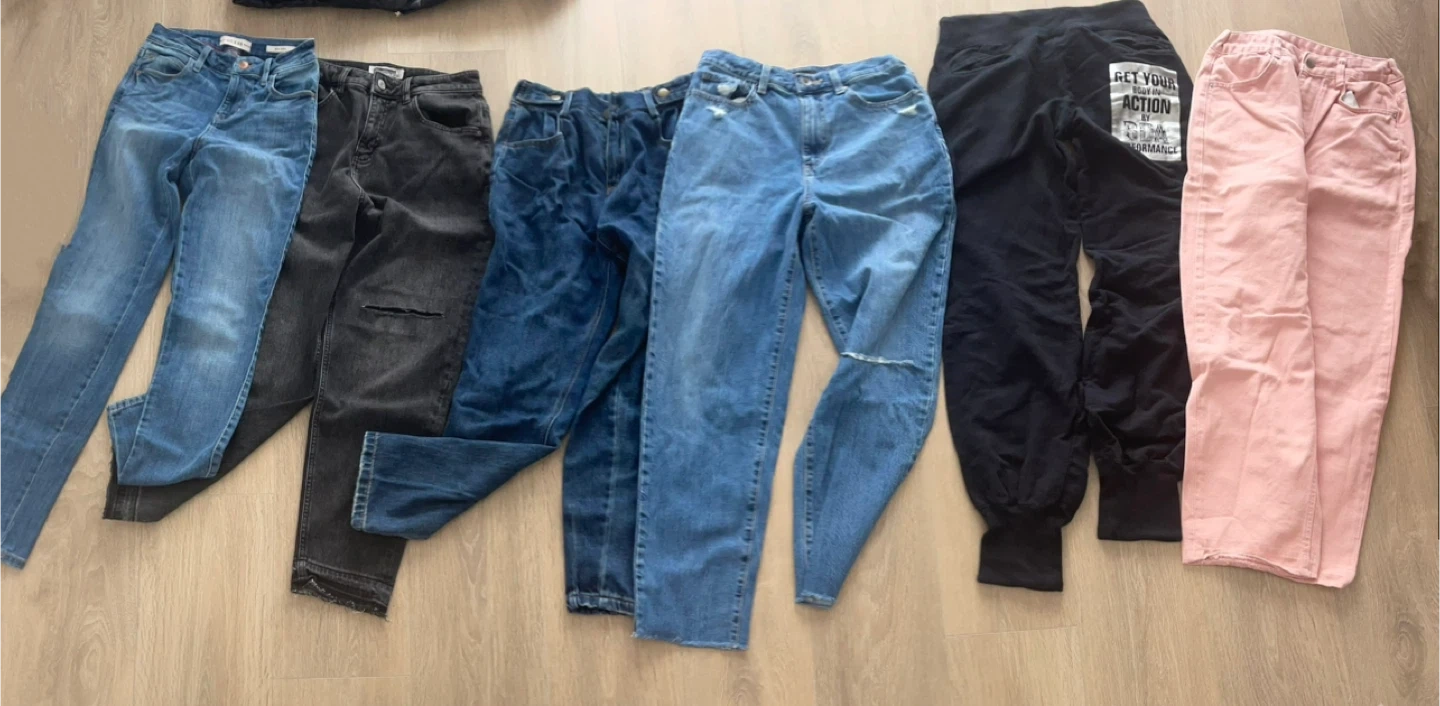 * 6 x Pairs of Pants/Jeans: Includes trendy light & dark wash denim, distressed jeans, a cute pair of pink straight-legs, and comfy Cotton Comfort black joggers.