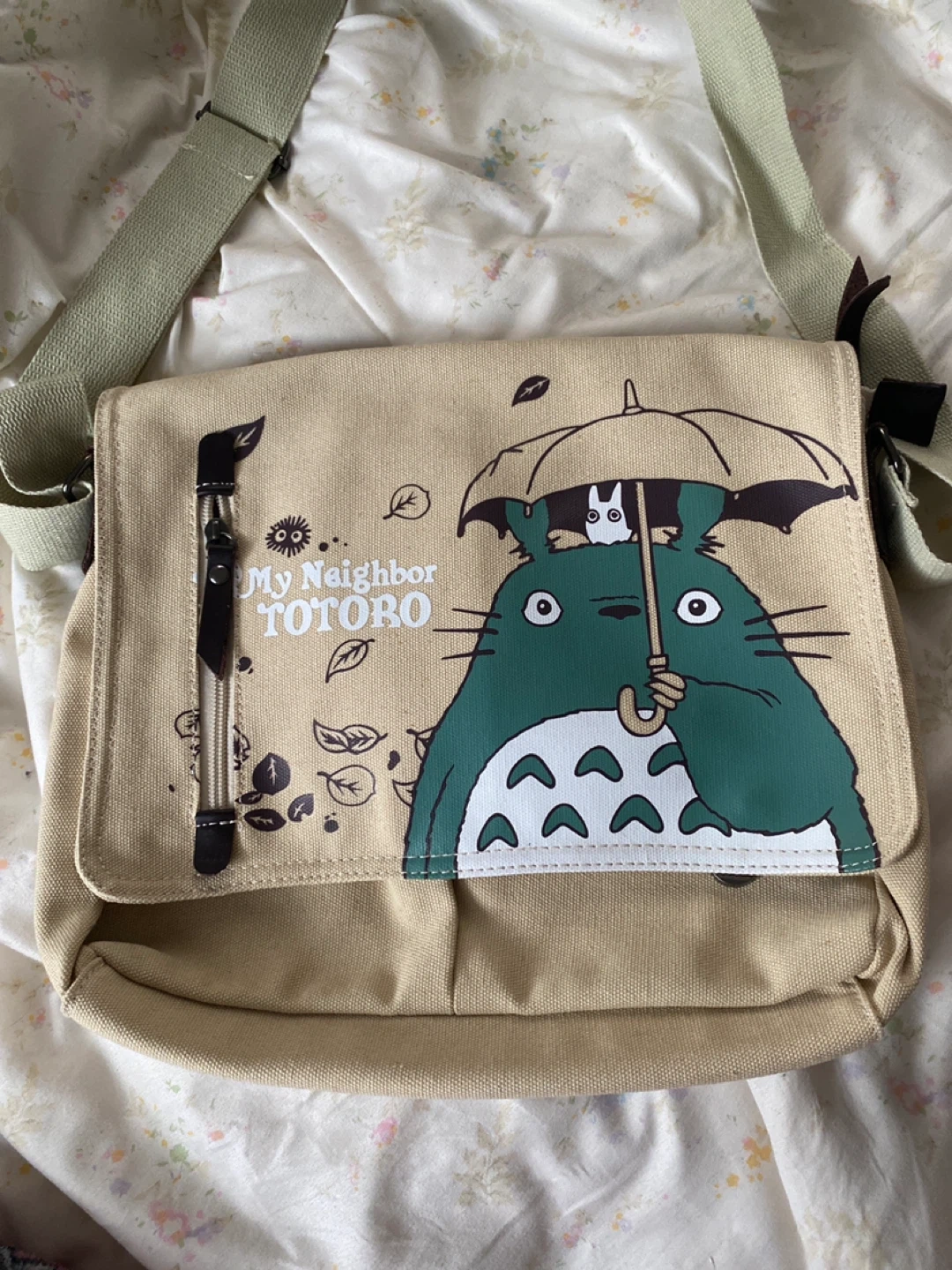 Cute beige canvas messenger bag featuring the beloved Totoro character under an umbrella. It's a fun and practical accessory for fans of the Studio Ghibli film. Great for carrying your essentials!