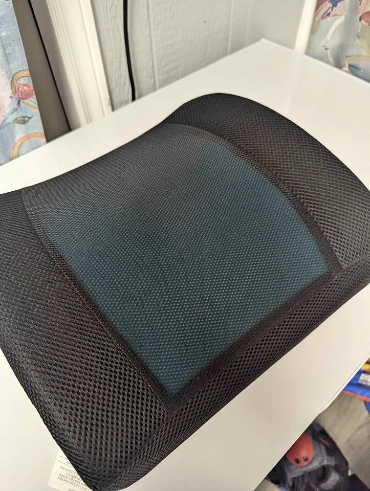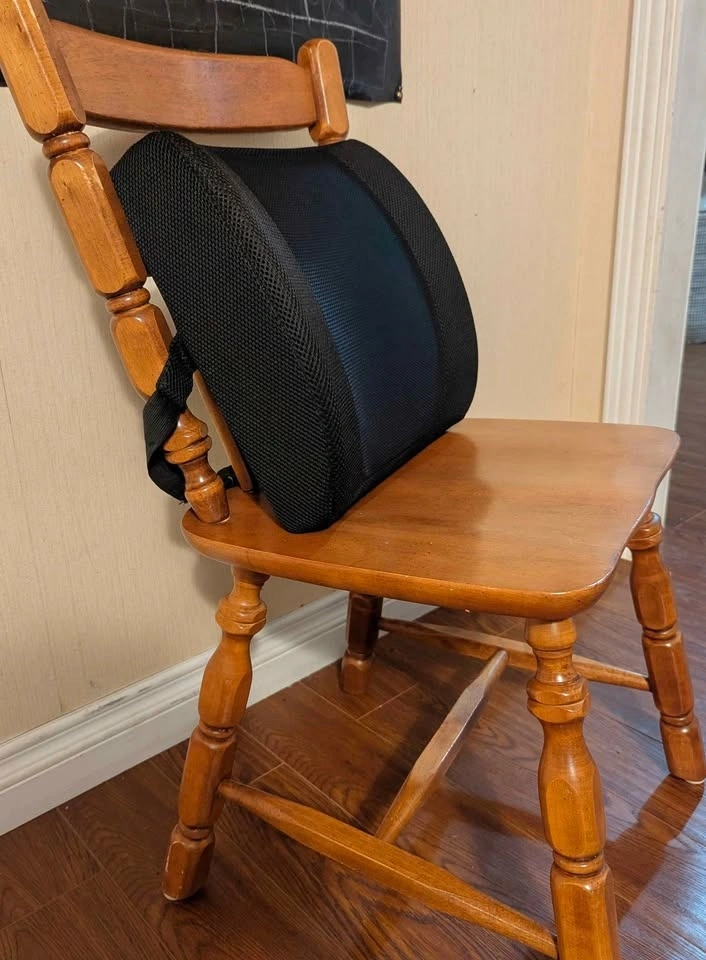 Comfortable ergonomic lumbar support cushion designed to improve posture and reduce lower back strain while sitting. Features breathable mesh fabric with firm yet comfortable support. Works great on wooden chairs, office chairs, or anywhere you need extra back support. Pickup in Port Coquitlam.