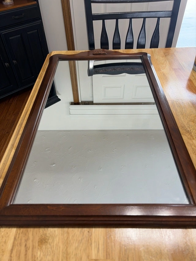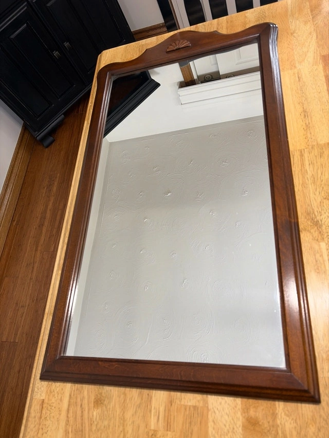This is a used wood frame mirror with a classic design, ideal for adding a touch of elegance to any room. Its sturdy construction and rich wood finish enhance its appeal. It's in good condition, showing only minor signs of wear, which adds to its vintage charm. This mirror is ready to brighten up your space with its reflective beauty! I'd estimate the value around $30 CAD. Feel free to message if you have any questions!