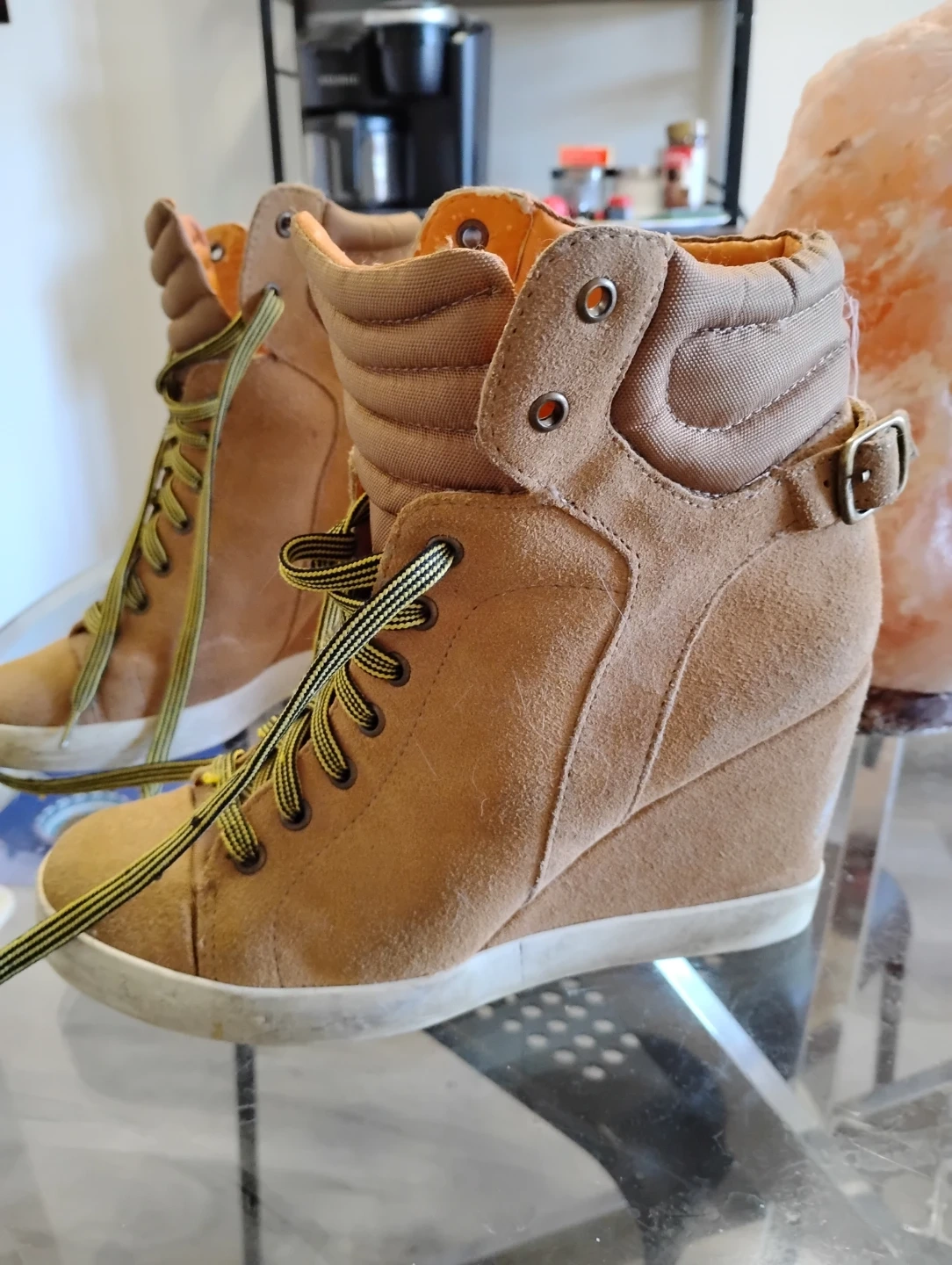 Comfortable wedge sneakers with a suede-like finish and lace-up closure. Features a padded collar and adjustable ankle strap. Good for casual wear!