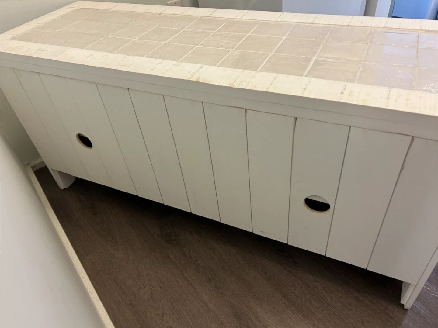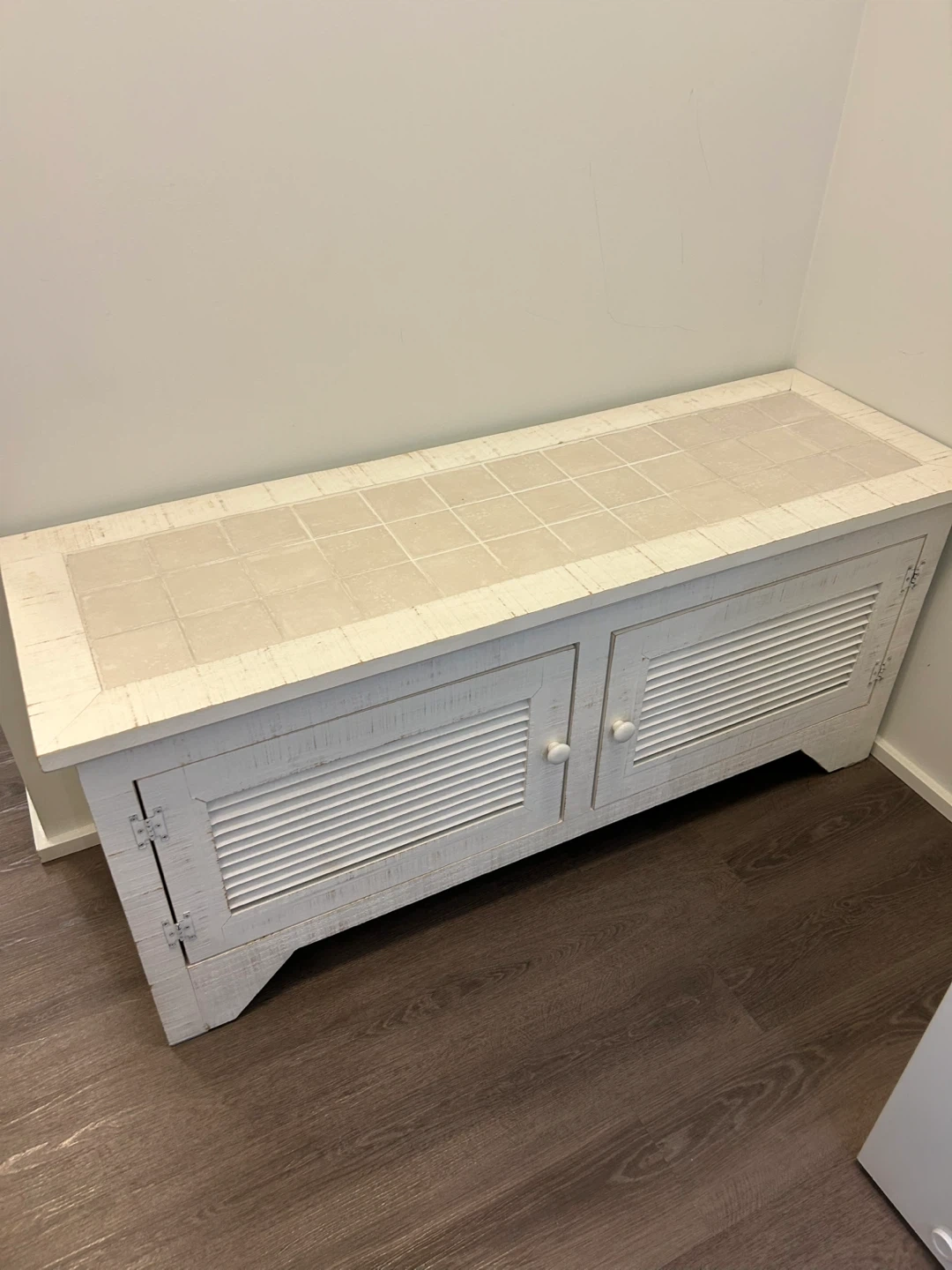 White console cabinet with louvered doors and tiled top. Features two doors with interior shelf for storage.