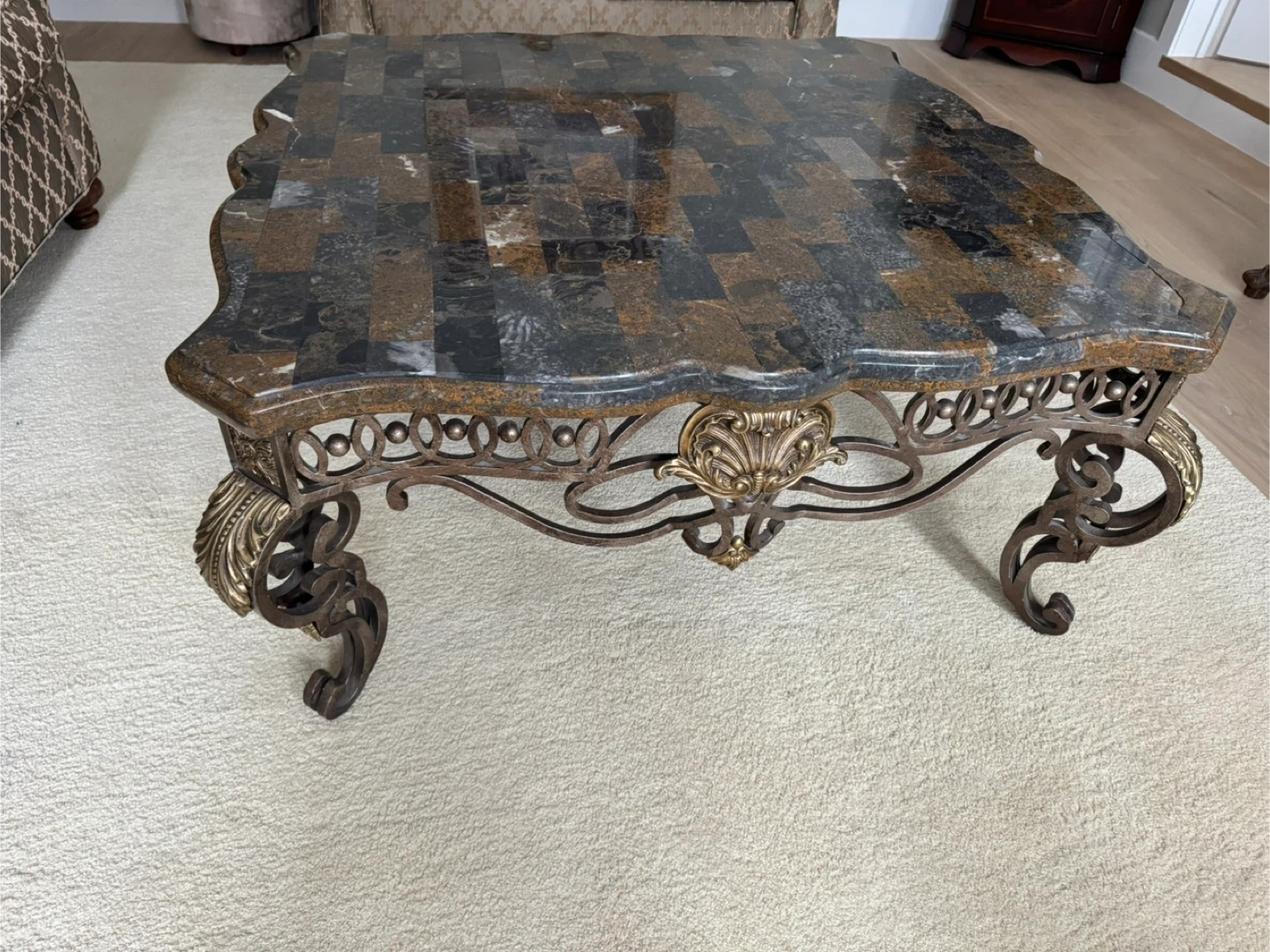 This coffee table features a unique marble top with a mosaic inlay of black, grey, and copper tones. It's supported by a decorative metal base with intricate scrollwork and ornate detailing on the legs. The table's design adds a touch of elegance to any living space.