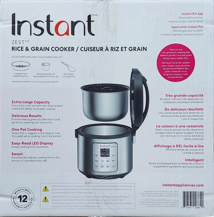 This Instant Pot ZEST Rice & Grain Cooker perfectly cooks rice, oatmeal, quinoa, and more. It's quick, easy, and features 7 one-touch programs. It also offers healthy cooking options for steam veggies, fish, and other foods.