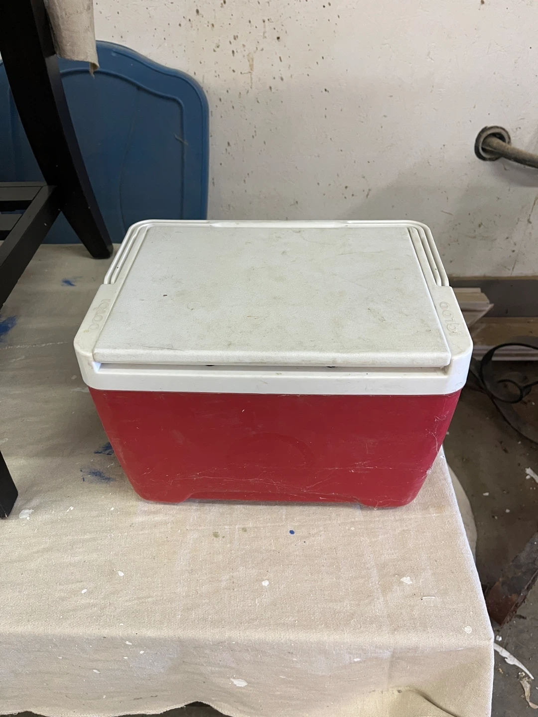 Small red and white Igloo cooler! It's perfect for keeping your drinks and snacks cold on picnics, camping trips, or at the beach. It's in good condition and ready for its next adventure 13” x 9” x 9”
