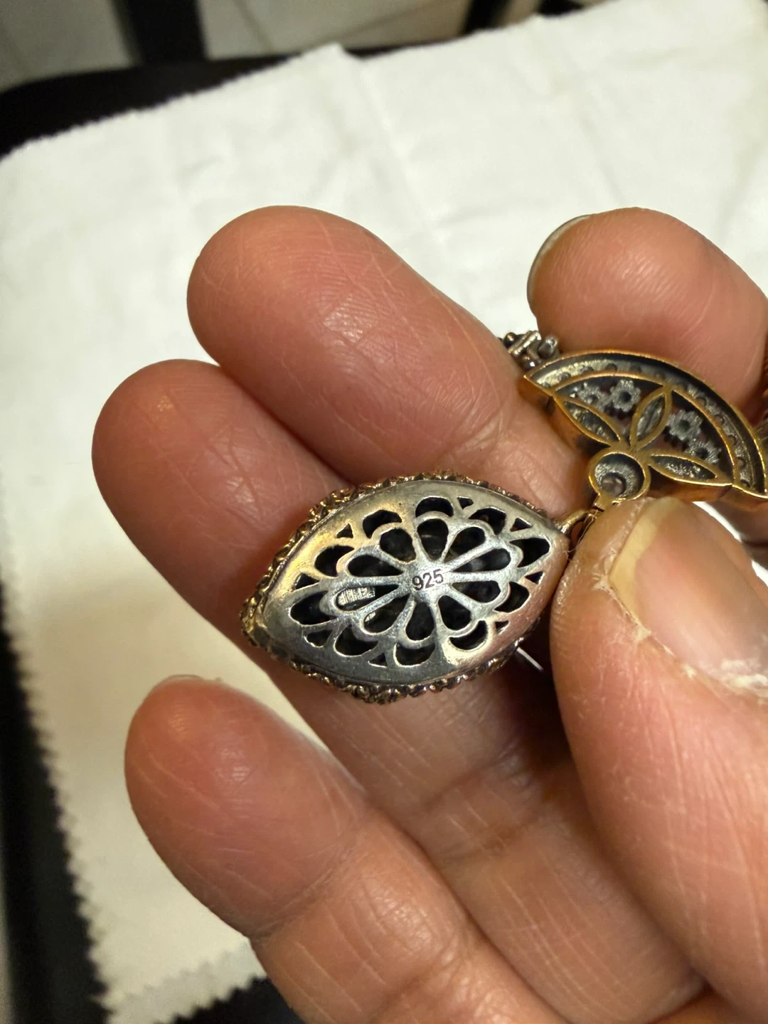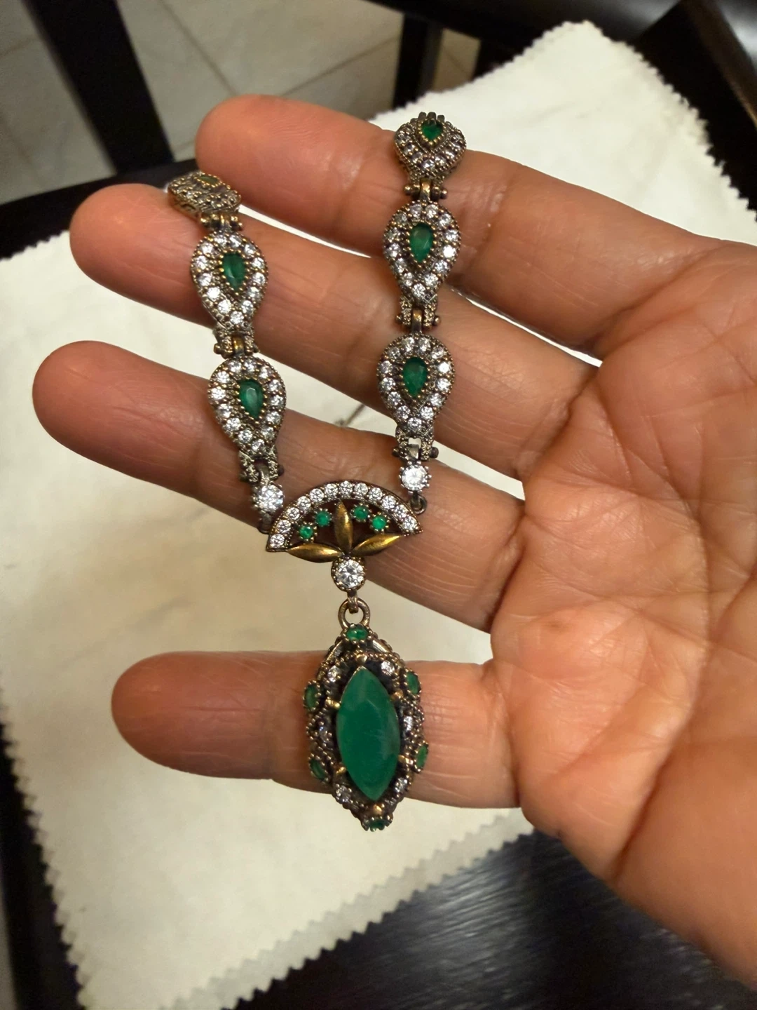 This elegant 18” necklace features a "925" sterling silver with copper chain and pendant. It's adorned with marquise-cut green gemstones and clear crystals. The intricate detailing on the pendant makes it a lovely statement piece.